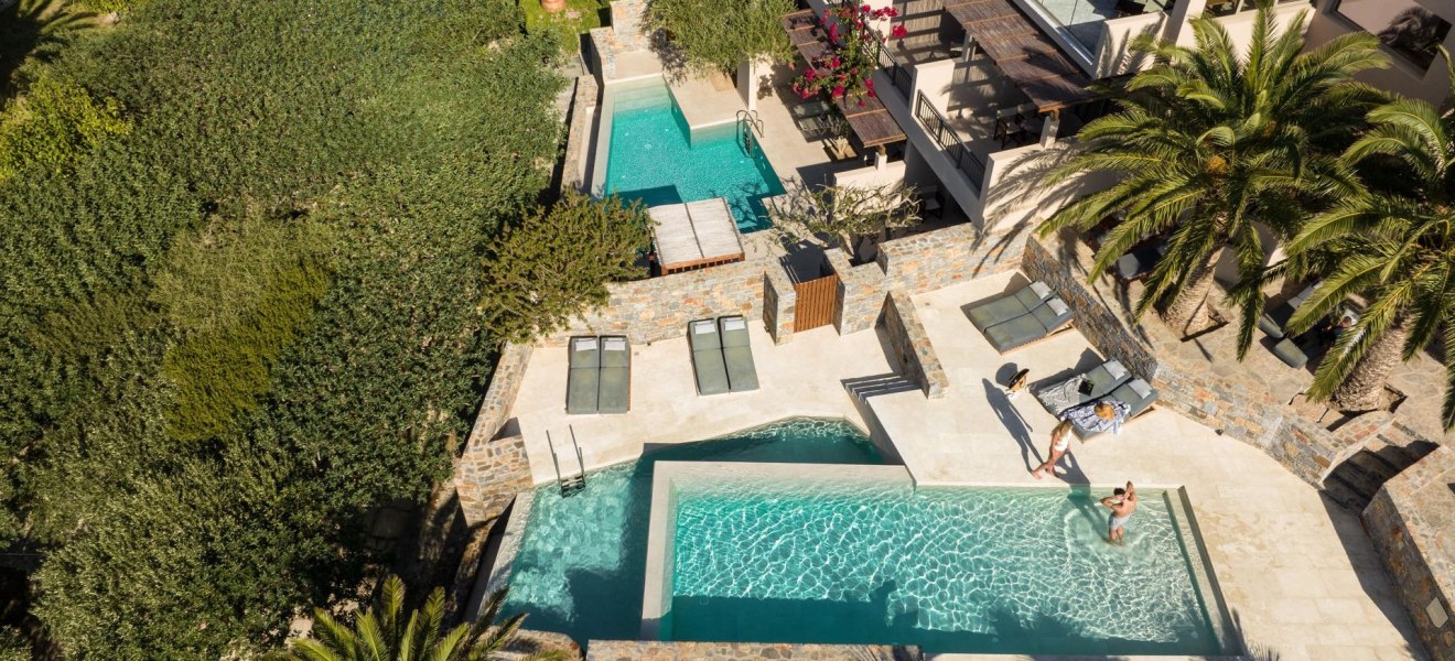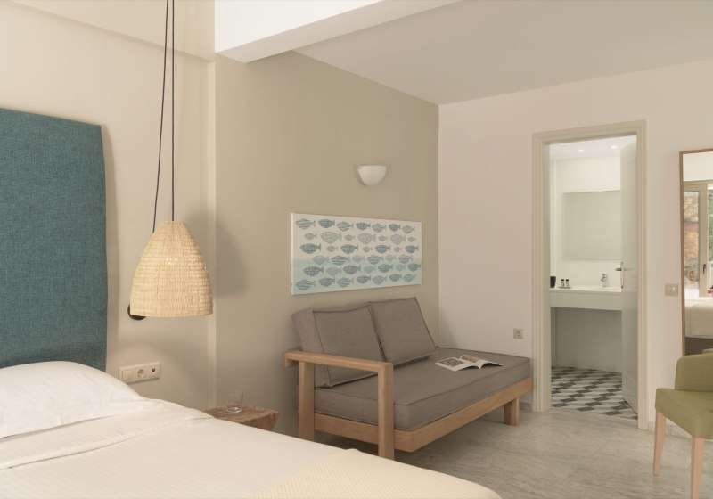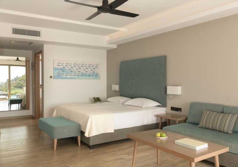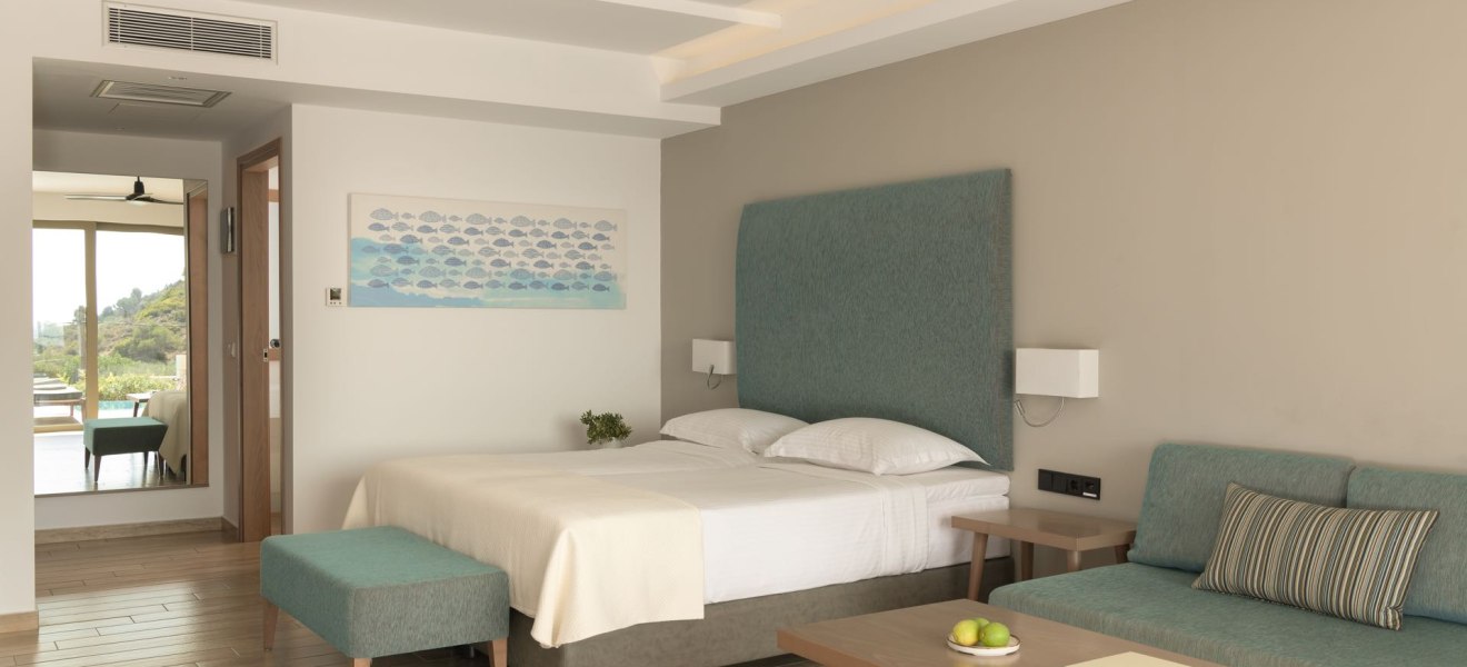 Klimatisierung erfolgt teils individuell, teils zentral. In einigen Juniorsuiten ergänzen schalldämmende Elemente und Deckenventilator den Komfort. Verfügbar sind Familienzimmer mit separatem Schlafzimmer sowie Juniorsuiten und Suiten, teils mit Sharing Pool, privatem oder Plunge Pool beziehungsweise Rooftop-Terrasse. Zimmer mit Meerblick oder privatem Garten sind auswählbar.