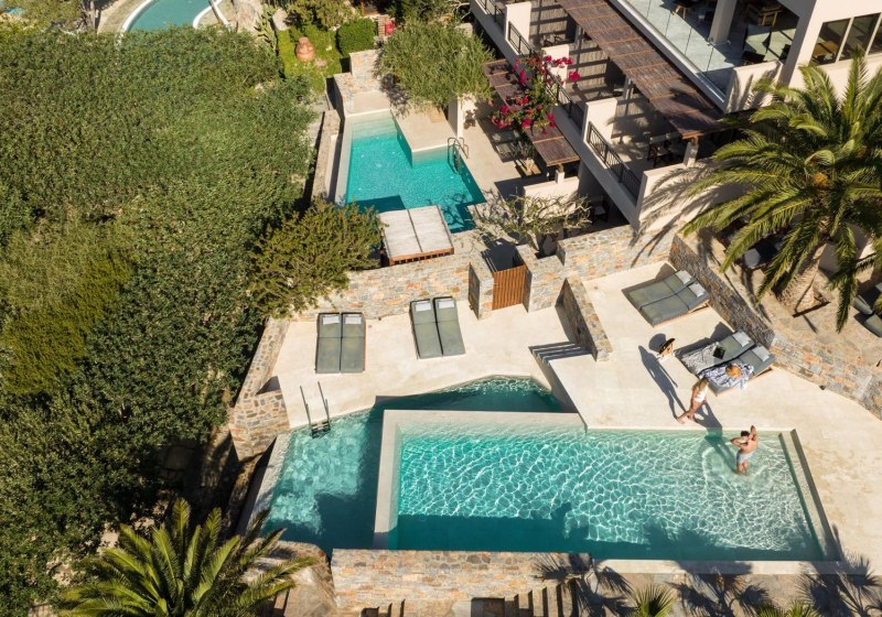 Rund um die Pools liegen Sonnenterrassen, Liegewiesen, Gazebos und ausreichend Liegen samt Handtüchern. Drei Halbsalzwasserpools, ein Kinderpool und eine Poolbar setzen die Akzente. Die Reinigungstechnik per Salzelektrolyse sowie ein magnesiumangereicherter Pool unterstreichen den gepflegten Charakter.