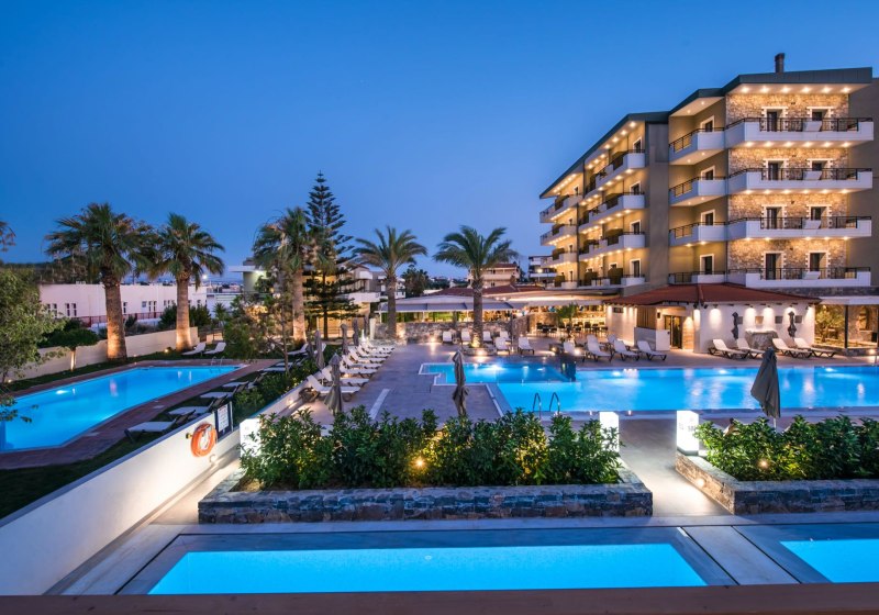 Die öffentlichen Bereiche sind klimatisiert, Sitzecken in Lobby und Garten laden zum Verweilen ein. Zwei Restaurants, eine Snackbar sowie zwei Bars inklusive Lobbybar geben Eurem Tag einen kulinarischen Rahmen – vom Frühstück bis zum späten Drink. Wer aktiv bleiben will, nutzt den Fitnessraum oder plant via Tour-Desk die nächste Etappe nach Rethymnon oder Hersonissos. Für Abwechslung sorgen Außenpool und Kinderpool, Sonnenliegen und Schirme. Parkplätze sind kostenfrei verfügbar. Highlight: Überschaubare Wege, mehrere Gastro-Optionen und Poolbereich vereinfachen Euren Rhythmus.