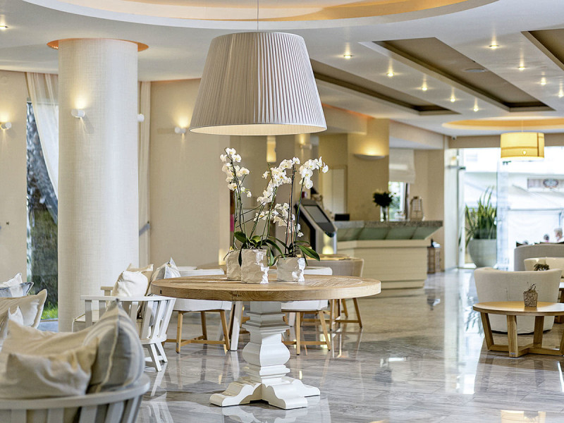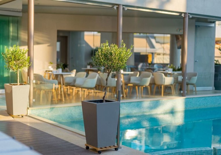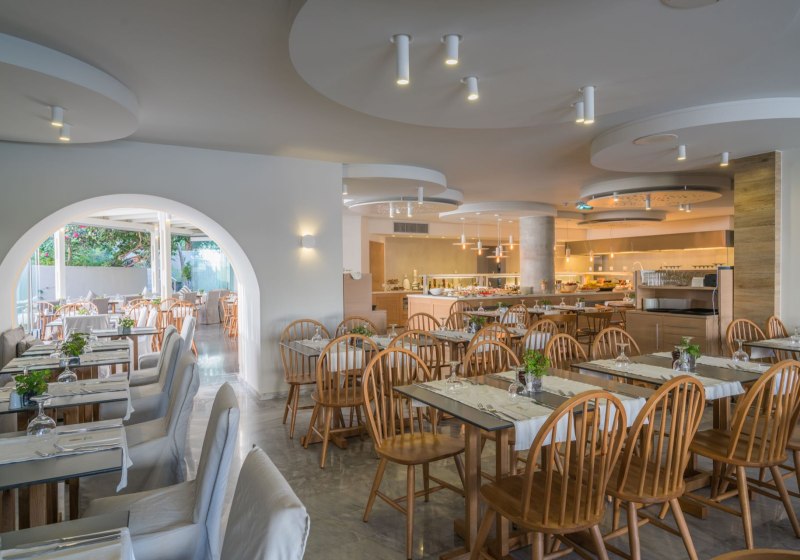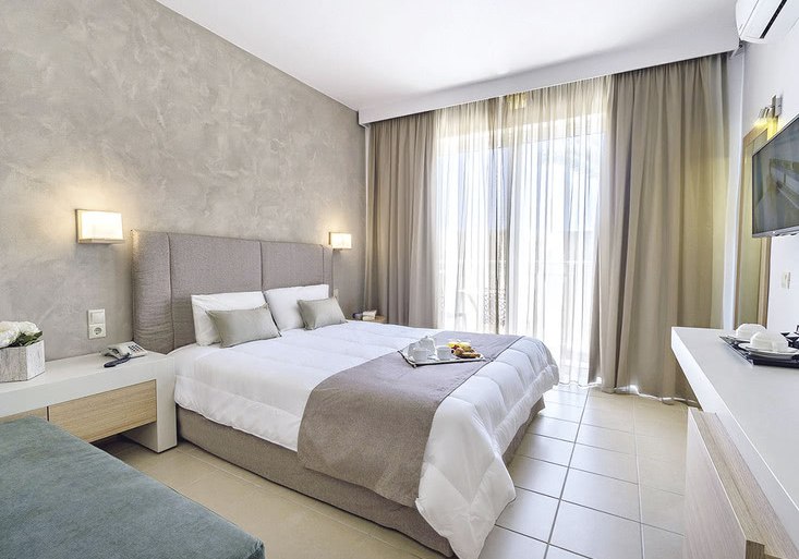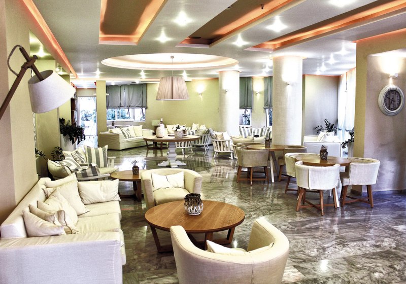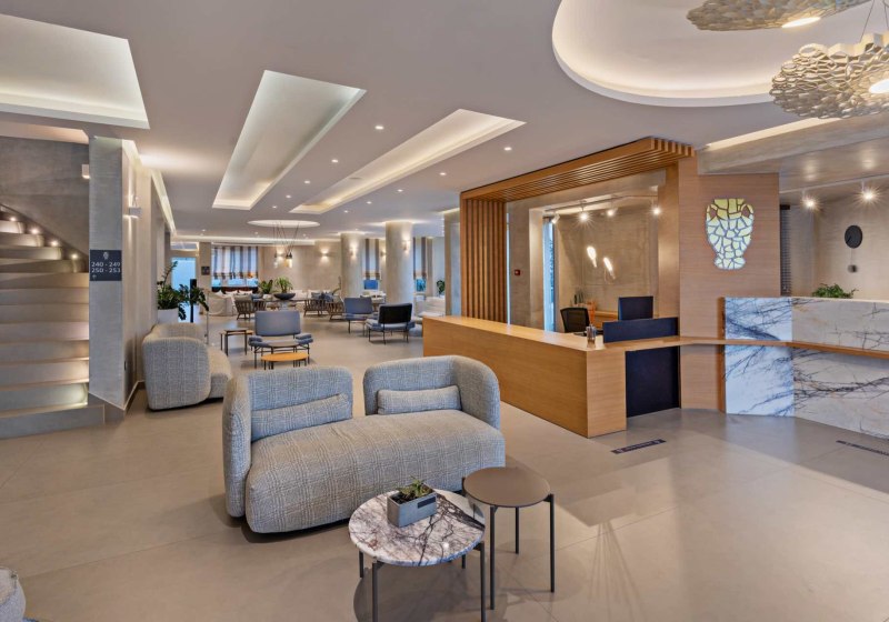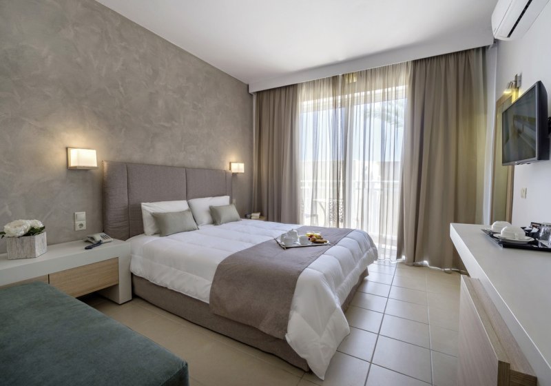 Im Nefeli wohnt Ihr in einem Strandhotel mit Familienfokus und klarer, aufgeräumter Atmosphäre. 105 Nichtraucherzimmer verteilen sich auf das Haupthaus und zwei Nebengebäude; das Haus wurde 1986 erbaut und 2007 renoviert. Der Ablauf wirkt strukturiert: 24-Stunden-Rezeption, kurzer Weg zu Pool und Garten, dazu klare Wege zum Hauptrestaurant und zur Snackbar. Ihr spürt die Nähe zum Meer, ohne direkt am Strand zu liegen – rund 200 Meter sind es bis zum Sand-/Kiesufer.