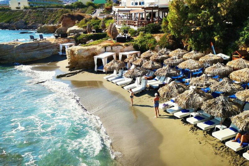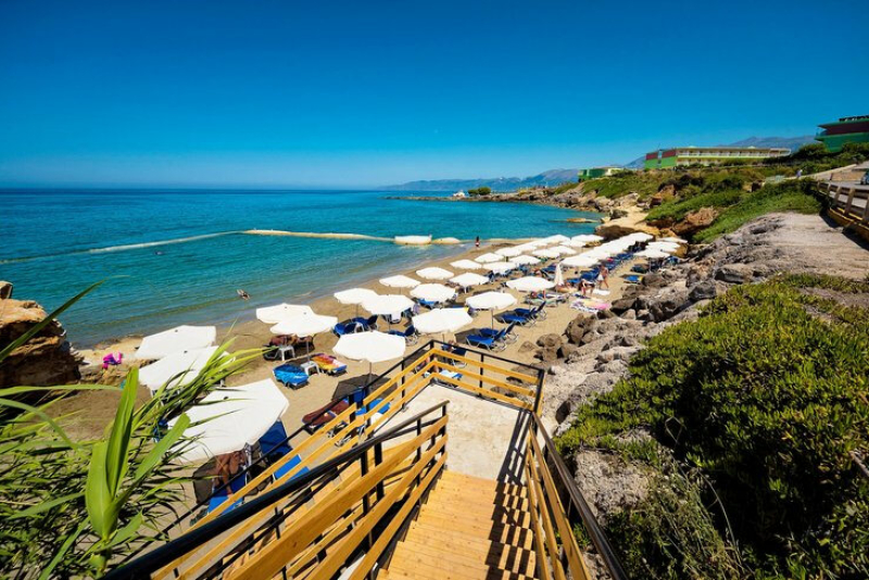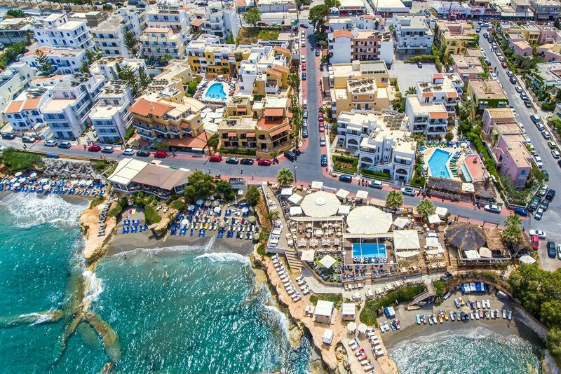 Das Porto Greco Village Beach Hotel liegt direkt am Strand, mit Zugang über Treppen. Der nächstgelegene Flughafen, N.Kazantzakis, ist 27 km entfernt. Das Stadt-/Ortszentrum ist nur 700 m entfernt und Einkaufsmöglichkeiten sowie Restaurants/Bars sind gut erreichbar. Für Golfliebhaber gibt es einen Golfplatz in 8 km Entfernung.