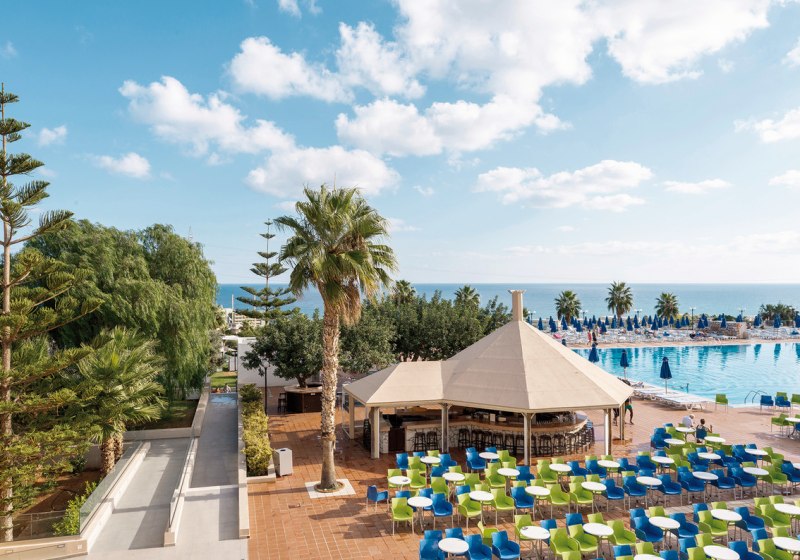 Die Anlage ist groß dimensioniert: Empfangshalle mit 24h-Rezeption, WLAN überall, Minimarkt und Souvenirshop, Friseur und ein Business-Center. Drei Außenpools, Sonnenterrassen mit Liegen und Schirmen sowie ein Kinderpool mit kleiner Wasserwelt bilden das Herz der Außenbereiche.