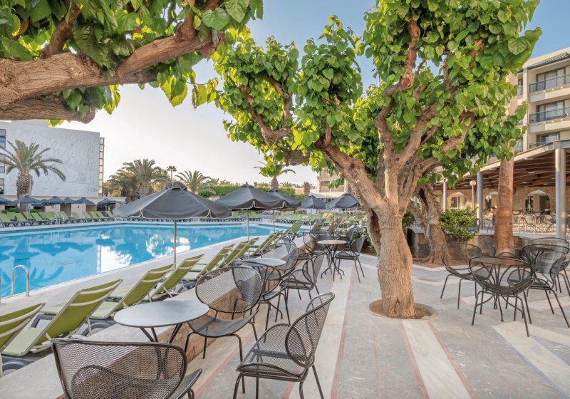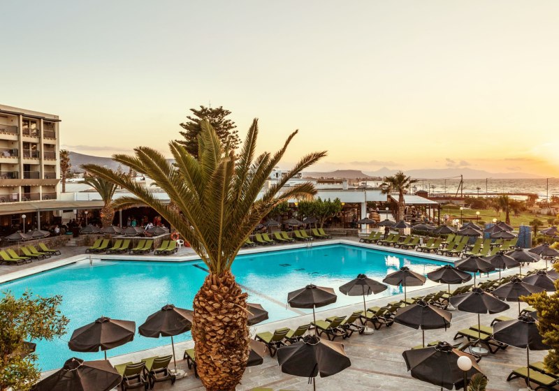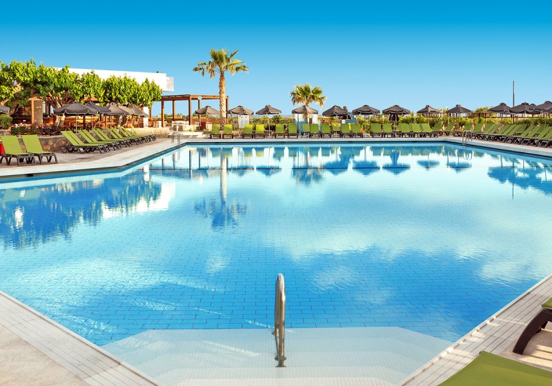 Im Sol Marina Beach Crete wohnt Ihr direkt am Sandstrand von Gouves und spürt sofort die gelassene Küstenatmosphäre Kretas. Zwei Meerwasserpools bilden das Herz der Anlage, daneben eigene Kinderpools – einer davon mit Wasserrutsche. Weitläufige Außenbereiche mit Garten und Liegewiese schaffen Raum, um zwischen Strand, Pool und schattigen Plätzen den Tag frei zu planen. Das Haus richtet sich an Familien und alle, die eine klare, unkomplizierte Strandlage mit komfortabler Infrastruktur suchen.