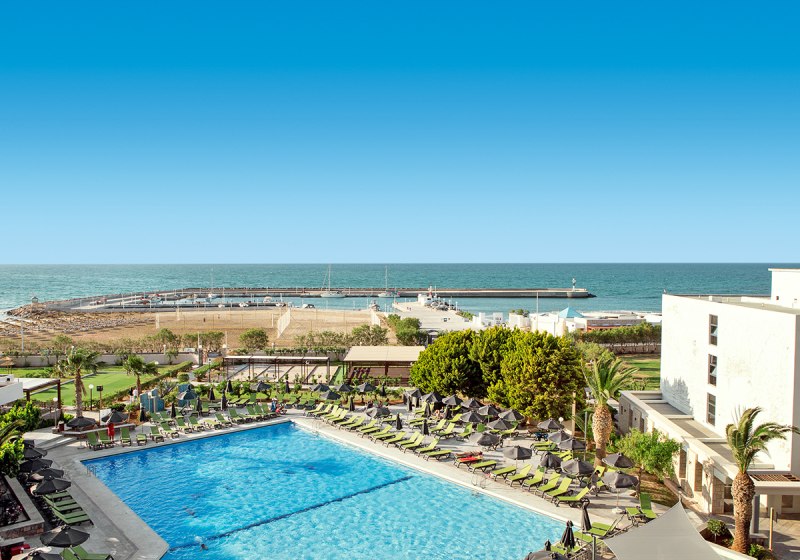 Sol Marina Beach Crete kombiniert die direkte Sandstrandlage von Gouves mit klarer Infrastruktur: Meerwasserpools, Kinderbereiche mit Rutsche, abendliche Shows, All-Inclusive-Küche und ein Spa mit Hallenbad. So entstehen Tage zwischen Strand, Pool und leichtem Entertainment.