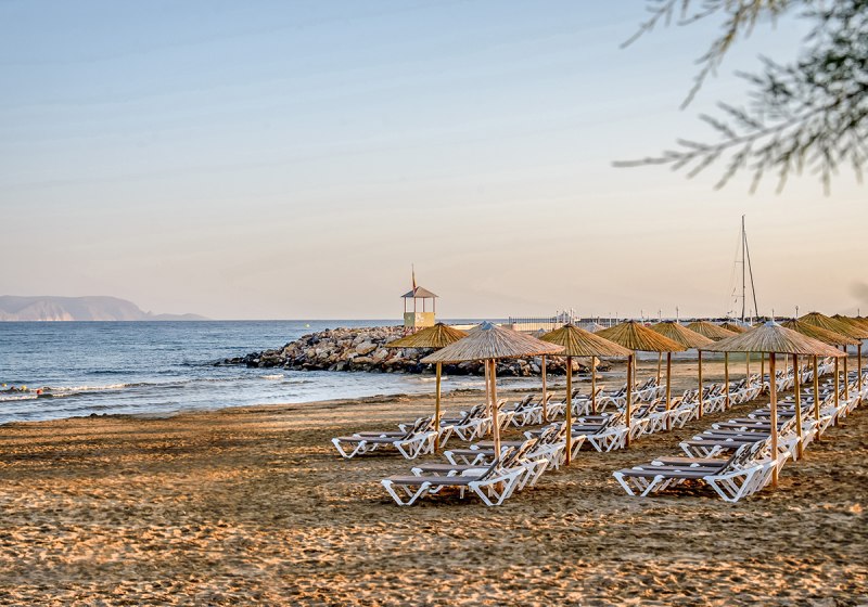 Ihr wohnt in Gouves auf Kreta, unmittelbar am Sandstrand – der direkte Zugang macht das Meer zum unkomplizierten Mittelpunkt Eurer Tage. Die Umgebung wirkt entspannt, mit der Küste als natürlichem Fixpunkt. Der Flughafen Heraklion liegt rund 15 Kilometer entfernt, was die An- und Abreise angenehm kurz hält. Strandspaziergänge beginnen im Resort, Poolpausen und Meeresblicke wechseln sich ohne Umwege ab. Highlight: Direkte Sandstrandlage in Gouves mit kurzer Anbindung an Heraklion.