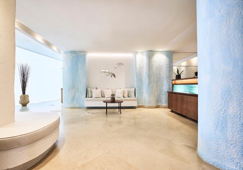 Die öffentlichen Bereiche sind klar strukturiert: Rezeption und Lobby führen in Boutique und Minimarkt, Wege öffnen sich zur Gartenanlage und zu Sonnenterrassen. WLAN ist in der gesamten Anlage verfügbar. Am Meerwasserpool warten Liegen und Schirme, am Strand zusätzlich Badetücher, Schirme und Liegen sowie ein Badeplateau.