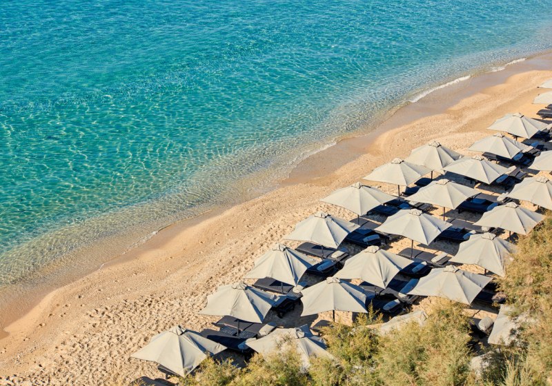 Ihr wohnt im Südosten von Mykonos, oberhalb des Elia-Strandes. Der Strand liegt etwa 250 Meter entfernt; ein kostenloser Shuttle bringt Euch bequem hinunter wie auch nach Mykonos-Stadt. Sowohl Stadt als auch Flughafen sind rund 12 Kilometer entfernt, was die An- und Abreise planbar macht. Am hoteleigenen Strandabschnitt erwarten Euch Liegen, Sonnenschirme und Handtücher. So verknüpft Ihr die Ruhe am Meer mit kurzen Wegen zu den urbanen Adressen von Mykonos-Stadt.