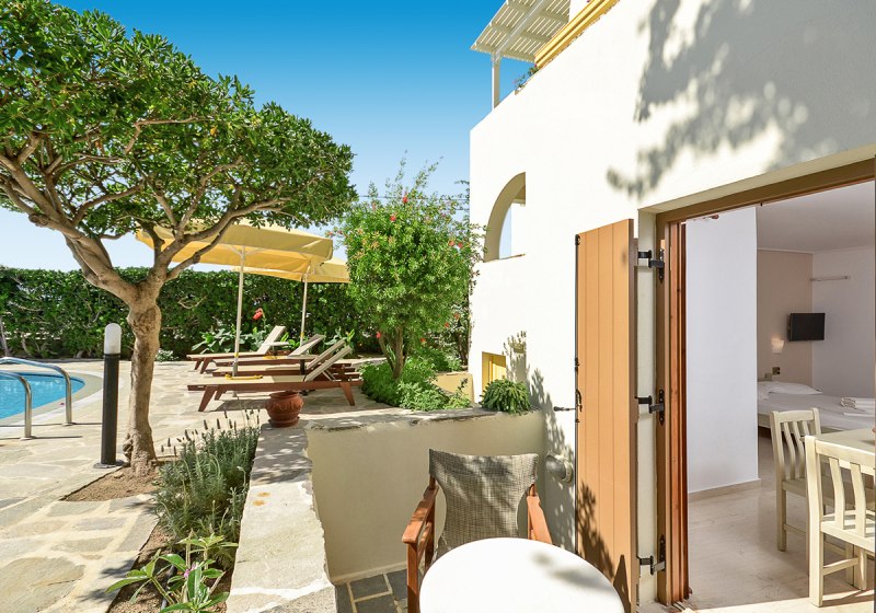 Alle Studios verfügen über Balkon oder Terrasse mit Gartenblick, wahlweise bucht Ihr Meerblick. So plant Ihr den Tagesablauf frei: Frühstück im Studio oder im Frühstücksraum, danach an Pool oder Strand. Bei Bedarf ist ein Zustellbett möglich, und Familien profitieren davon, dass Kinder kostenlos übernachten. Das Design bleibt bewusst schlicht, der Nutzen steht im Vordergrund.