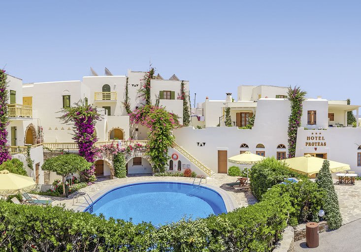 Proteas steht für ruhige Tage nahe dem Sandstrand Agios Prokopios, mit Studios für flexible Selbstversorgung und einem klaren 3‑Sterne-Rahmen. Außenpool, Sonnenterrasse, Garten und Bar schaffen entspannte Übergänge vom Morgen bis zum Abend.