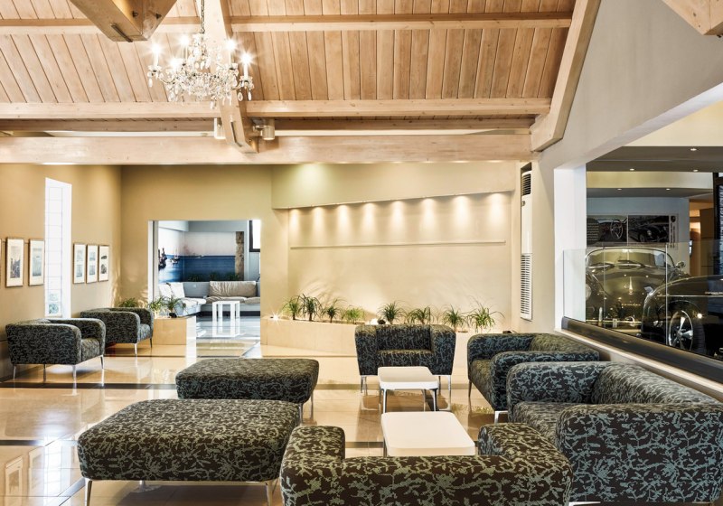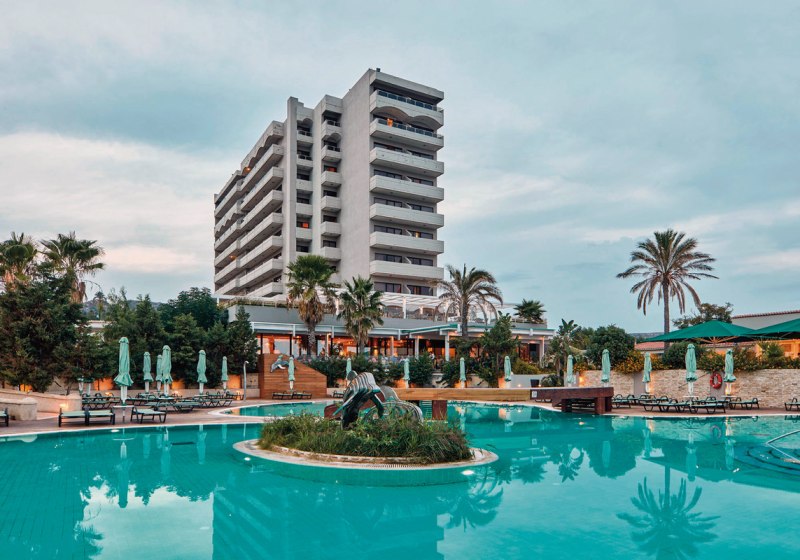 Im Haus erwartet Euch ein Mix aus modernisierten Bereichen und klassischer Resort‑Anmutung. WLAN ist im gesamten Hotel verfügbar, Web Check‑in erleichtert die Anreise. Mit Hauptrestaurant, À‑la‑carte‑Option, Kafenion, Casino Bar und Beach‑/Poolbar seid Ihr kulinarisch flexibel. Fitnessraum, Tennis und Minigolf sorgen für Bewegung, der Spa‑Bereich mit Hallenbad und Sauna für wohldosierte Ruhe. Das Resort wurde 2018 renoviert, umfasst 152 Zimmer auf acht Etagen und bietet All‑Inclusive mit breitem Spektrum an Kostformen.