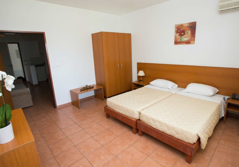 Ihr wohnt in Apartments mit separatem Schlafzimmer und einem Wohnbereich, in dem Zustellbett oder Schlafsofa Platz finden. Die Kitchenette mit Kühlschrank unterstützt Euch bei kleinen Mahlzeiten. Bad/WC sind klassisch gelöst, ein Föhn steht an der Rezeption auf Anfrage bereit. Balkon oder Terrasse erweitern den Raum ins Freie.