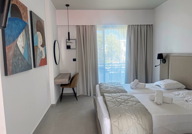 Die Zimmer von Hotel Danae sind zweckmäßig ausgestattet, damit Ihr Euch auf das Wesentliche konzentriert. Balkon oder Terrasse verbinden Innen und Außen, Sat-TV und Radio liefern Begleitung zwischendurch. Für Wertgegenstände steht ein Safe gegen Gebühr bereit. In vielen Einheiten ergänzt ein Kühlschrank, teils gegen Gebühr, Eure Vorratshaltung – praktisch für Getränke nach dem Strand.