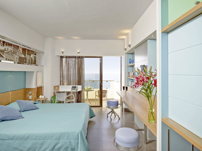 Die Zimmer bieten Balkon oder Terrasse sowie Bad mit Dusche oder Wanne, dazu Föhn, Bademantel und Slipper. Für Komfort sorgen zentral gesteuerte Klimaanlage, Sat‑TV, Telefon, WLAN und Safe. Ein Minikühlschrank ist Standard, Minibar auf Anfrage. Der Look bleibt hell und funktional; Fliesenboden und Aussenmöbel unterstützen das Klima im Sommer.