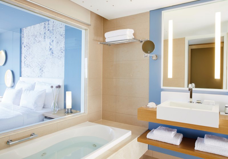 Die Zimmer sind auf Rückzug und Blick ausgerichtet. Ihr schlaft im Kingsize-Bett, steuert die individuelle Klimaanlage, entspannt in der Whirlpoolbadewanne und nutzt die separate Dusche/WC. Bademäntel und Hausschuhe liegen bereit, ebenso Föhn, Flatscreen-Sat-TV, Safe und WLAN inklusive. Minibar (gegen Gebühr) und Nespresso-Maschine ergänzen den Komfort.