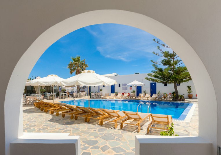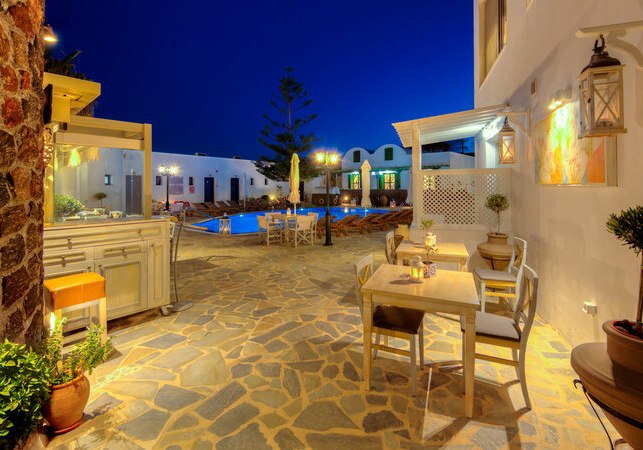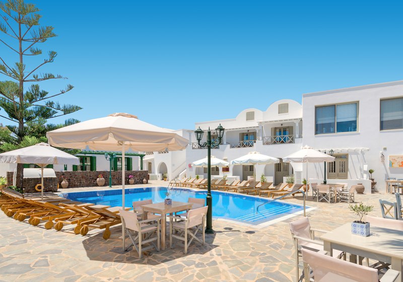 Im Hotel Mathios Village erwartet Euch ein entspanntes Haus mit 32 Zimmern und zwei Etagen in ruhiger Lage von Akrotiri. Ihr bewegt Euch durch gepflegte Bereiche mit Garten, Sonnenterrassen und einem Außenpool, wo Liegen und Sonnenschirme bereitstehen. WLAN ist inklusive, Ihr bleibt also jederzeit verbunden. Für erfrischende Pausen liegen Snackbar, Café, Bar und Poolbar nah beieinander, während Ihr im Restaurant oder in der Taverne den Tag kulinarisch rundet. Wer ankommen, auspacken und ohne Umwege in den Aufenthalt starten möchte, findet eine strukturierte, übersichtliche Umgebung vor.
