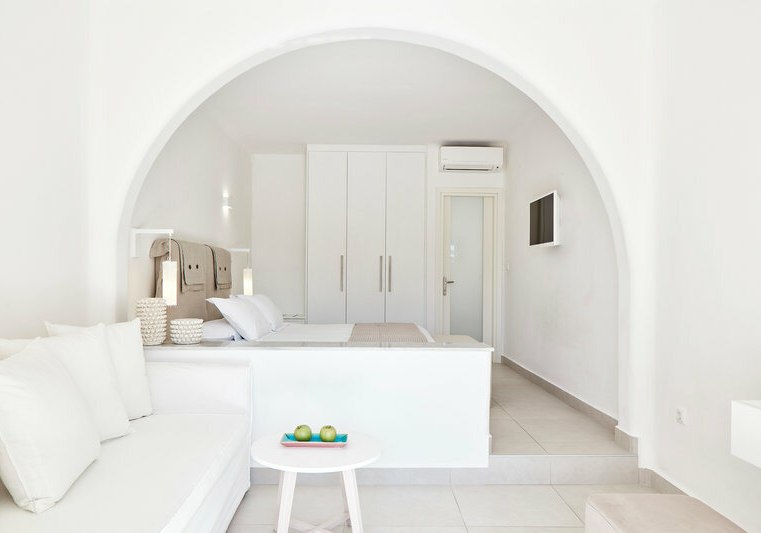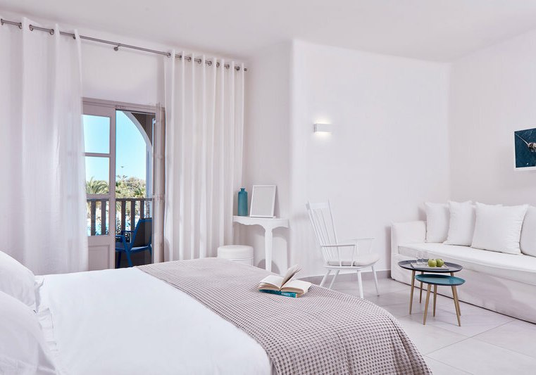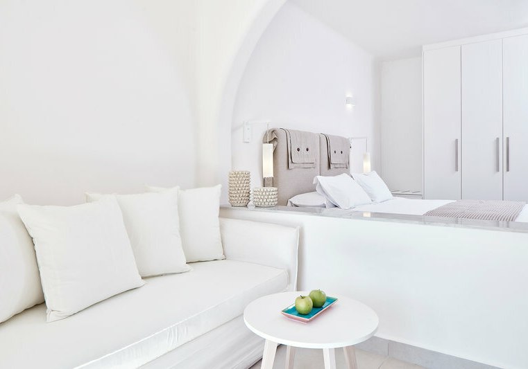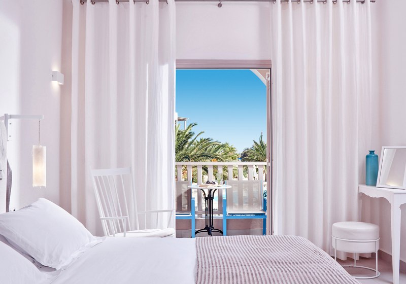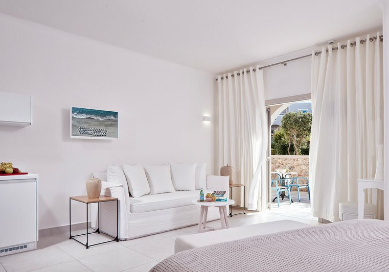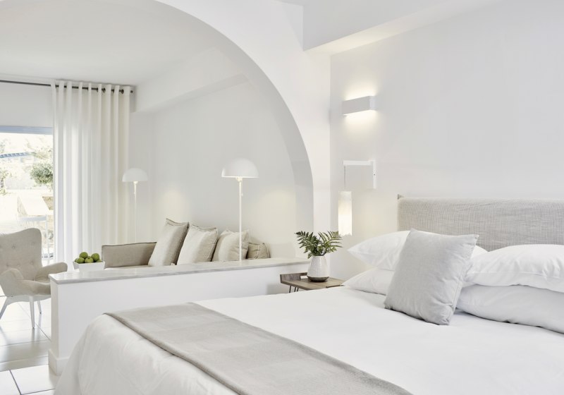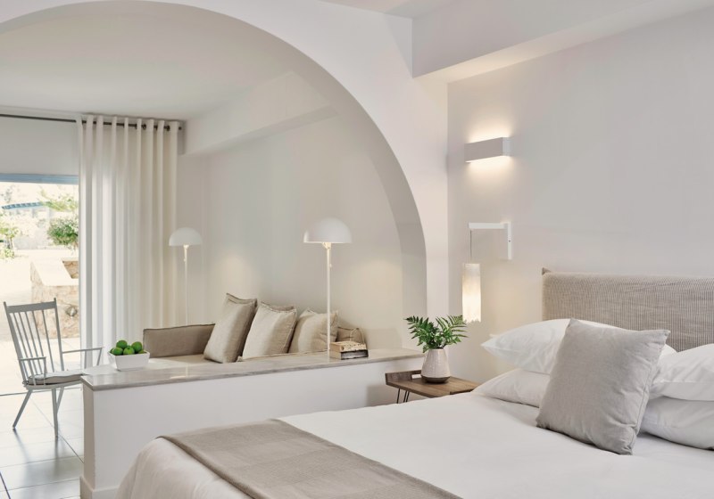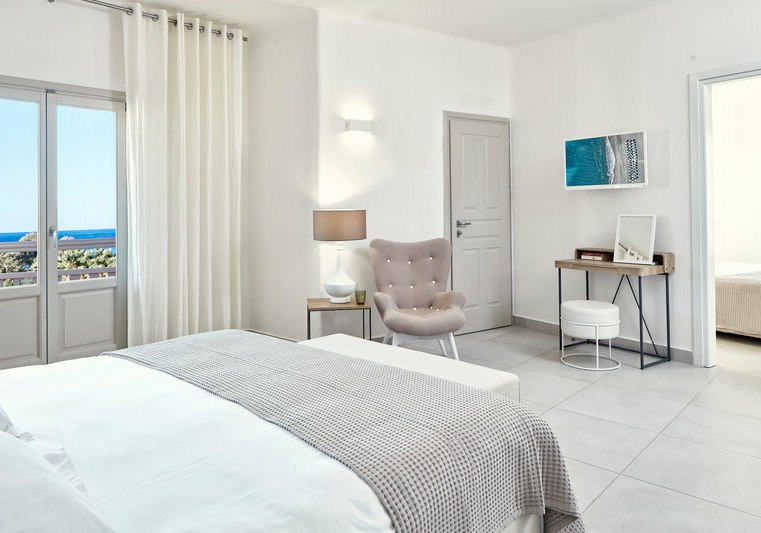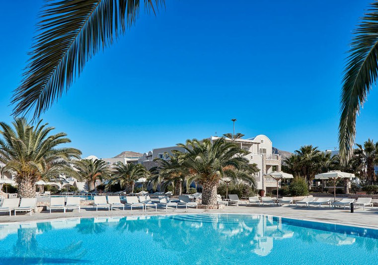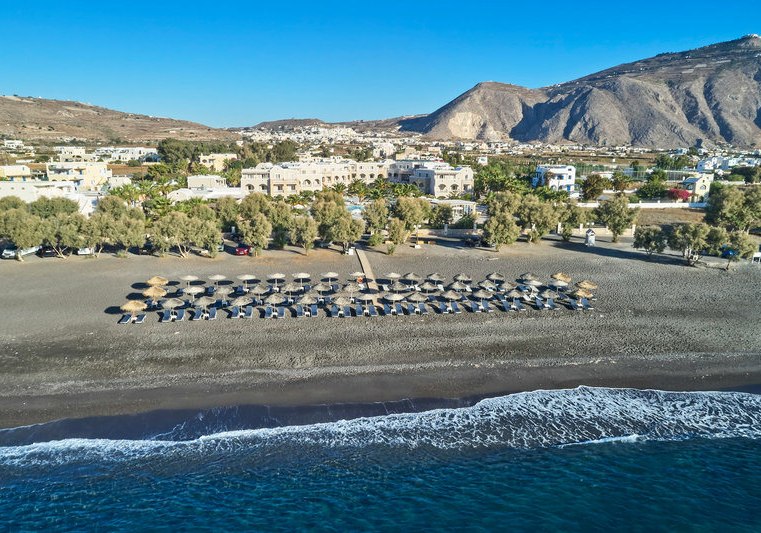 Im Santo Mira Mare Resort wohnt Ihr direkt am schwarzen Sand von Perivolos – mit dem Meer vor der Tür und kurzen Wegen durch die gepflegte Anlage. Die Stimmung ist klar und entspannt: Wege führen vom Empfang zur Poolzone, weiter zum hoteleigenen Strandabschnitt mit Liegen und Schirmen. Familien und Strandliebhaber finden hier unkomplizierte Tage zwischen Wasser, Sonne und Zeit für sich.