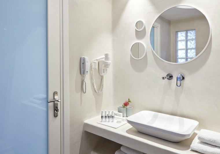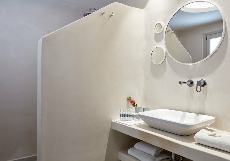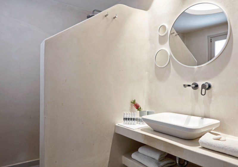 Perivolos auf Santorini steht für dunklen, feinkörnigen Vulkansand – genau hier liegt Santo Mira Mare Resort direkt am Strand. Der eigene Abschnitt mit Liegen und Schirmen grenzt an die Poolzone, sodass Ihr zwischen Meer und Wasserbecken wechselt, ohne Umwege. Die Promenade ist nah, das Umfeld wirkt entspannt und gut strukturiert.