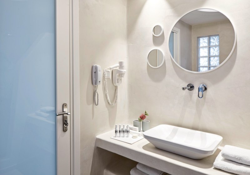 Ihr wohnt in hellen Doppelzimmern ab etwa 25 Quadratmetern – mit Klimaanlage, TV, Safe und Minikühlschrank. Dusche, WC und Föhn sind selbstverständlich, der Fliesenboden hält alles angenehm pflegeleicht. Balkon oder Terrasse öffnen den Blick ins Freie; einzelne Zimmer bieten Meerblick. Das Setup ist klar, funktionsstark und alltagstauglich.