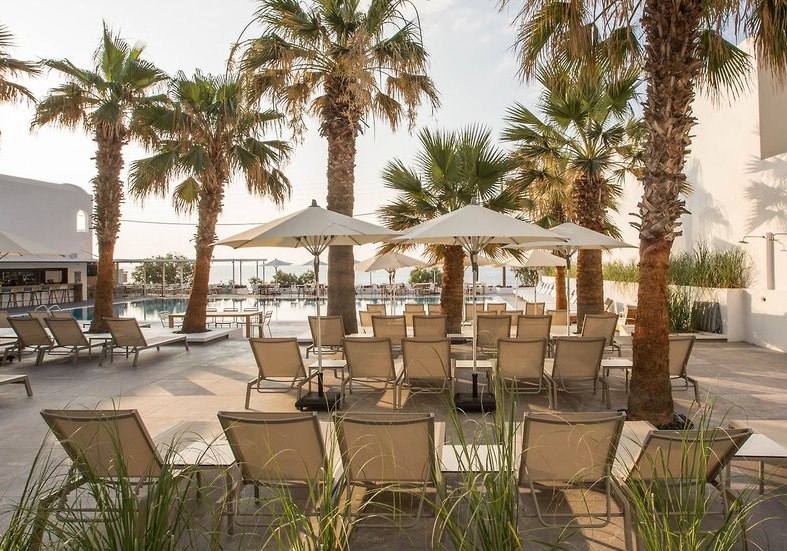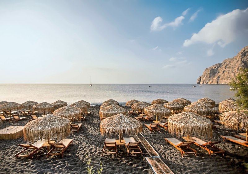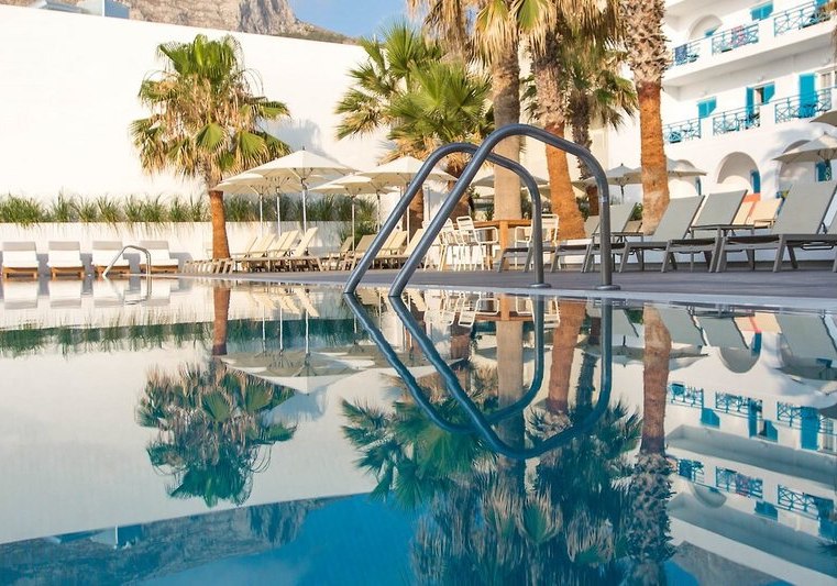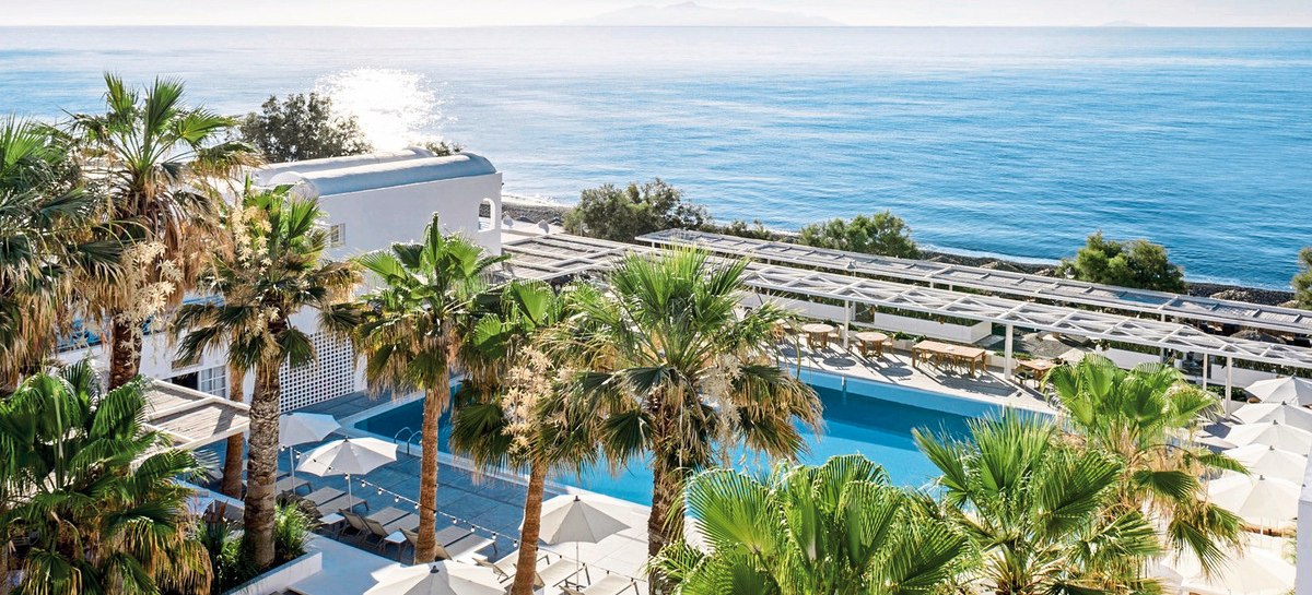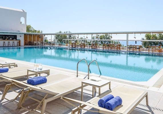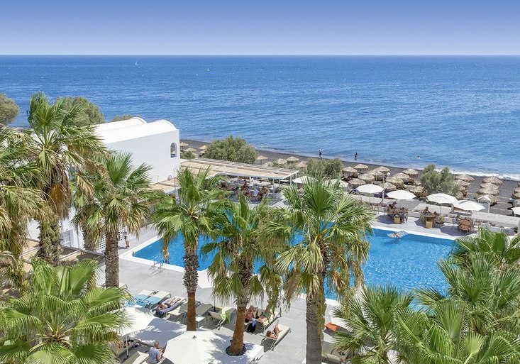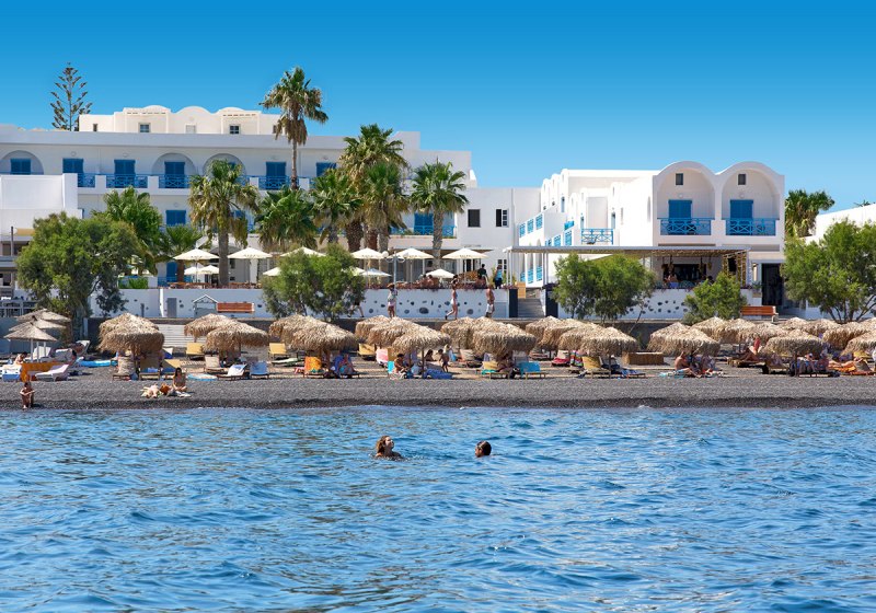 Das Kamari Beach Hotel punktet mit seiner Lage an der Promenade von Kamari, dem direkten Zugang zum schwarzen Lavastrand und einer klaren, funktionalen Anlage. Pool, Terrassen und kurze Wege prägen Euren Tagesrhythmus – nah am Ort, nah am Meer.