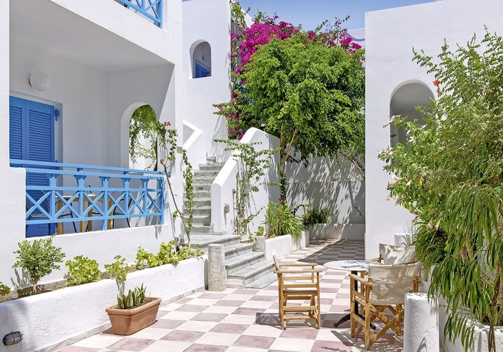 Im Kamari Beach Hotel wohnt Ihr unmittelbar an der Promenade von Kamari, nur durch den Weg vom schwarzen Lavastrand getrennt. Die Anlage wirkt überschaubar und klar strukturiert: Wege führen über Terrassen und durch Grünflächen zum Außenpool, zu Lounges und zum Frühstücksraum mit Terrasse. Ihr spürt Strandnähe, kurze Wege und eine angenehme, unkomplizierte Ferienroutine.