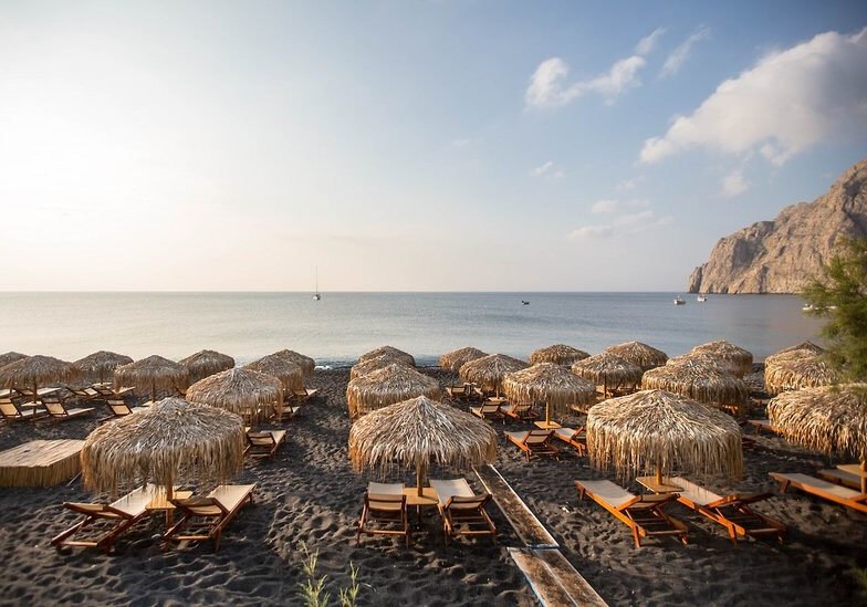 Ihr wohnt in Kamari auf Santorin, in erster Strandreihe – nur die Promenade trennt Euch vom schwarzen Lavastrand. Das Zentrum von Kamari erreicht Ihr nach etwa 150 Metern, ideal für kurze Wege zu Cafés, kleinen Geschäften und der lebendigen Strandmeile. Eine Linienbushaltestelle liegt in unmittelbarer Nähe, sodass Ihr flexibel auf der Insel unterwegs seid, ohne lange Transfers planen zu müssen. Der Blick richtet sich auf Meer und Promenade, das Urlaubsgefühl stellt sich beim ersten Schritt vor die Tür ein.