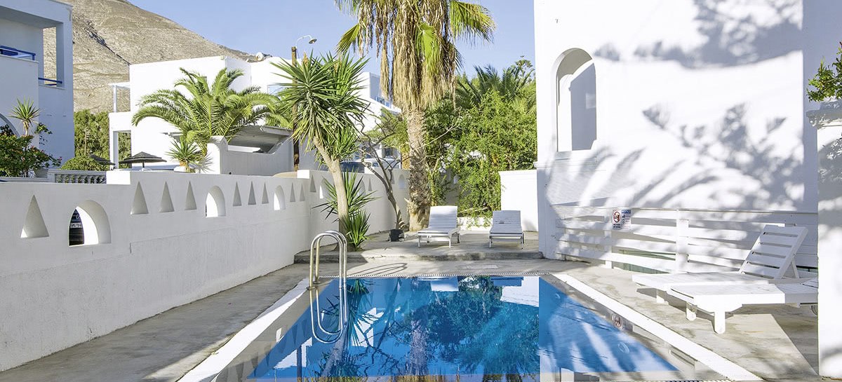 „Wer einen kompakten Rückzugsort nahe dem schwarzen Strand von Kamari sucht, findet im Kymata Hotel ein ruhiges Basislager mit Pool, Sonnenterrasse und einfachem Komfort – ideal für kurze Wege zwischen Strand und Ortskern.“