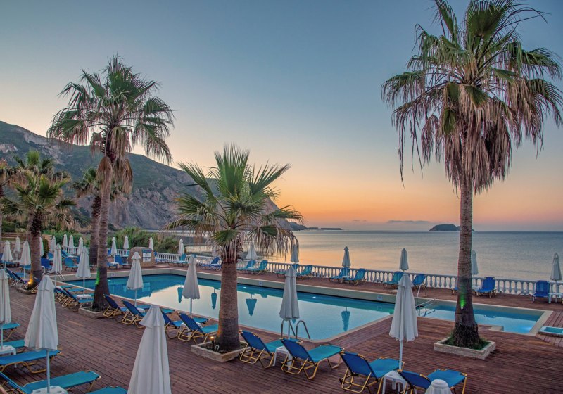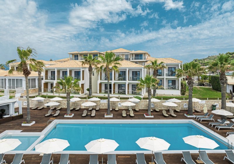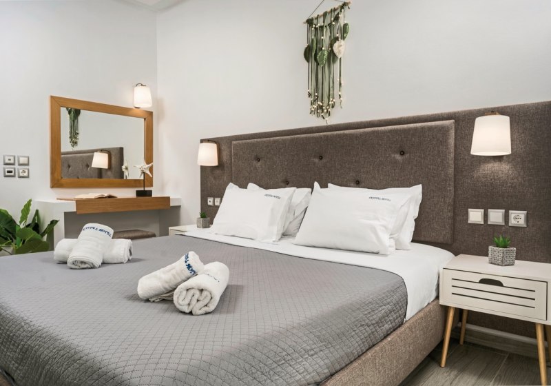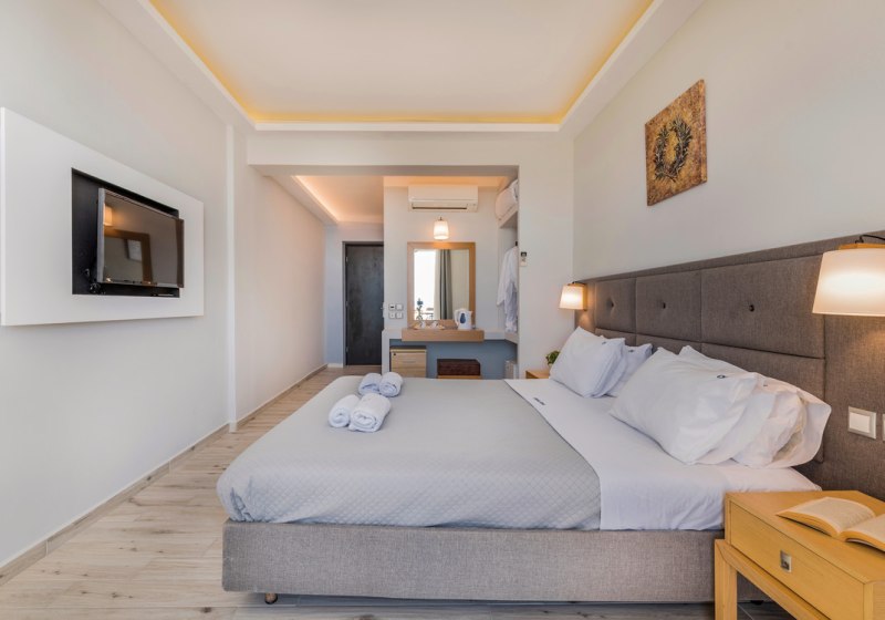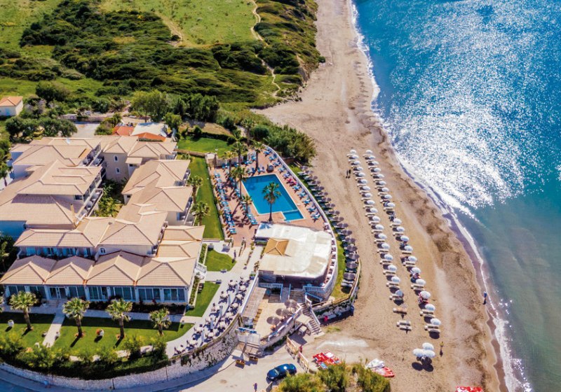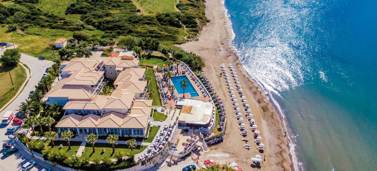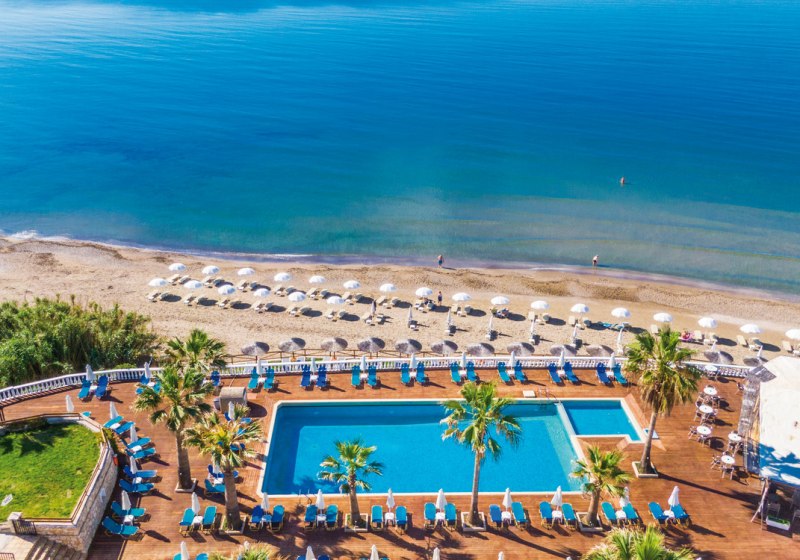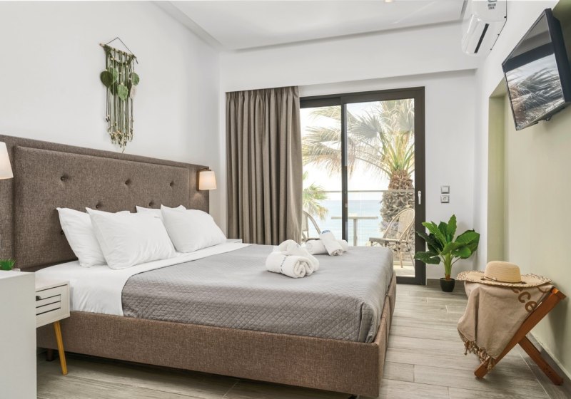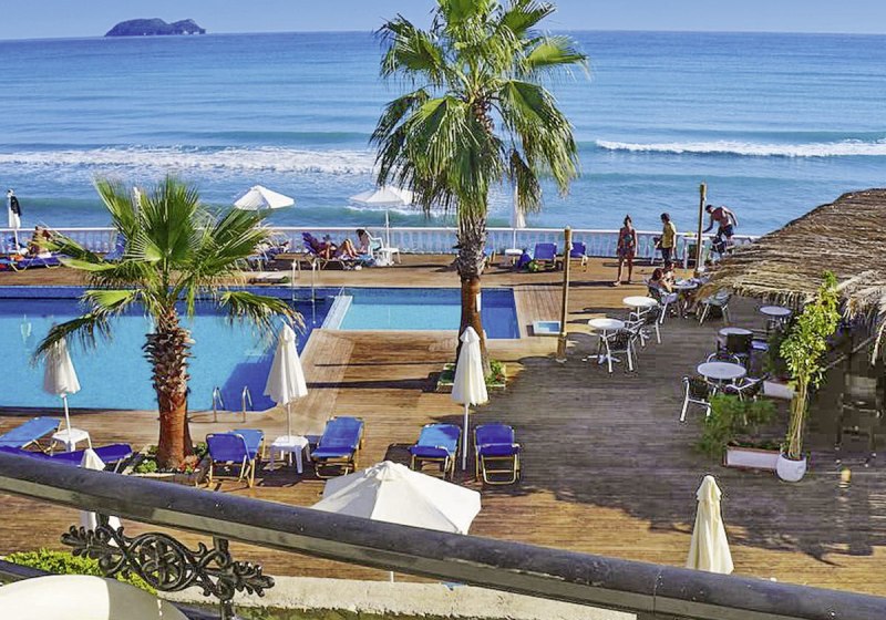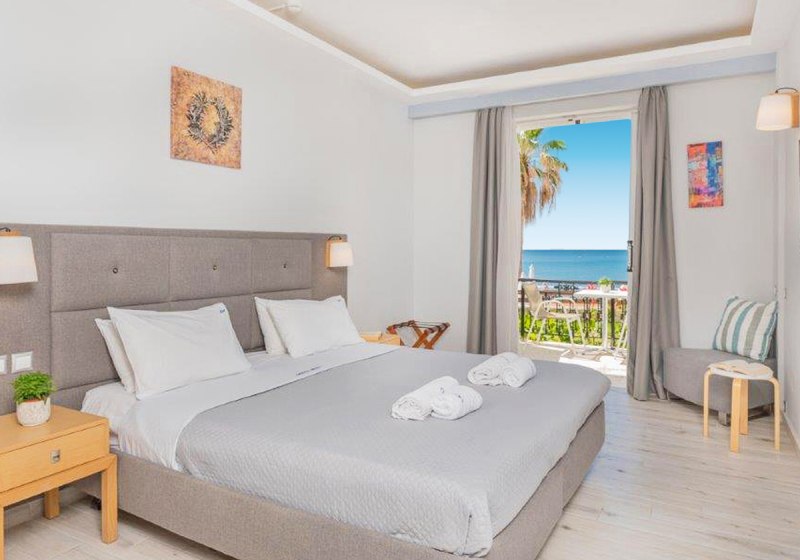 Willkommen im Crystal Beach, einem überschaubaren Strandhotel mit 62 Zimmern direkt am Sandstrand von Kalamaki. Hier wohnt Ihr nah am Wasser und bewegt Euch in kompakten Wegen zwischen Lobby, Garten, Sonnenterrasse und Pool. Die Atmosphäre bleibt entspannt, mit Servicepräsenz rund um die Uhr und kurzen Distanzen zu Bars und Restaurants.