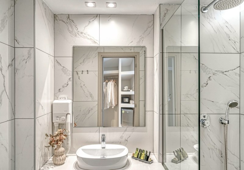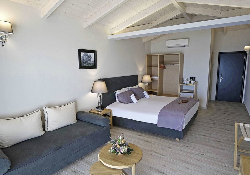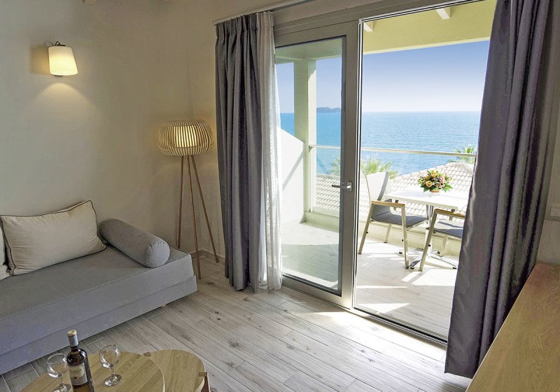 Die Zimmer konzentrieren sich auf das Wesentliche: Klimaanlage, TV, kostenloses WLAN, Bad mit Dusche oder Badewanne und Föhn. Ein Balkon oder eine Terrasse gehört dazu. Einige Kategorien öffnen den Blick aufs Meer, andere auf die Berge oder den Garten – ruhig, klar strukturiert und funktional eingerichtet.