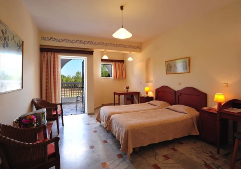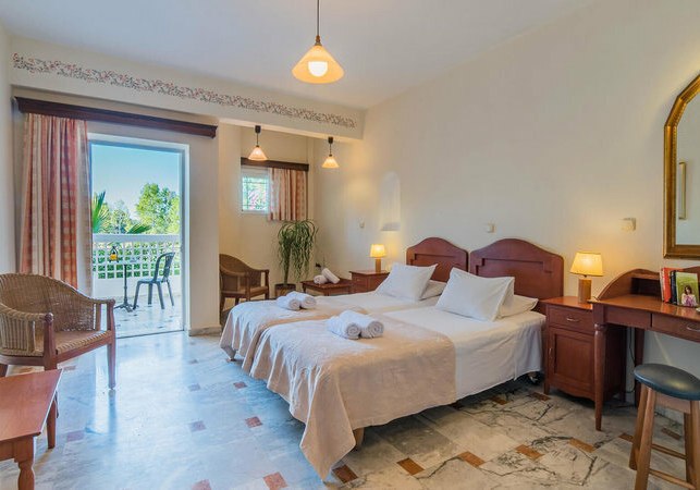 Ilaria empfängt Euch zwischen Kalamaki und Laganas mit einer ruhigen, aufgeräumten Atmosphäre. 38 Zimmer, kurze Wege und klare Strukturen prägen den Aufenthalt. Ihr bewegt Euch durch Lobby, Bibliothek und TV-Raum in einen grünen Garten mit Pool und Sonnenterrasse – ideal für entspannte Tage im Urlaub.