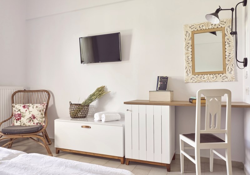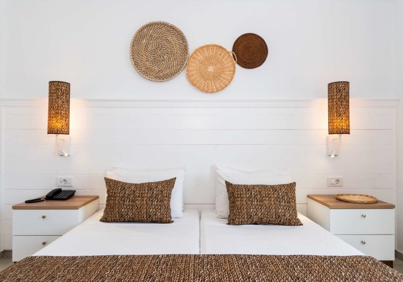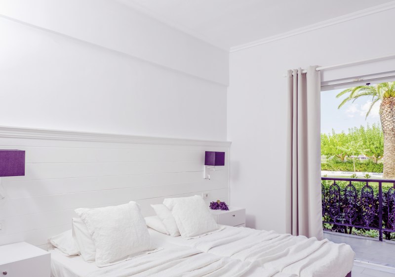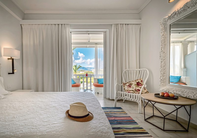 Ihr wohnt in Doppelzimmern oder Juniorsuiten, verteilt auf Haupt- und Nebengebäude. Alle Kategorien bieten Dusche, WC, Telefon, Sat-TV mit Musikkanal, WLAN und Klimaanlage. Ein Kühlschrank und ein Safe gehören ebenso zur Ausstattung. Draußen wartet ein privater Außenbereich als Balkon oder Terrasse.