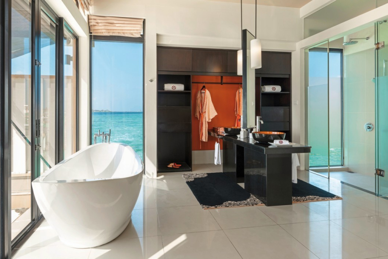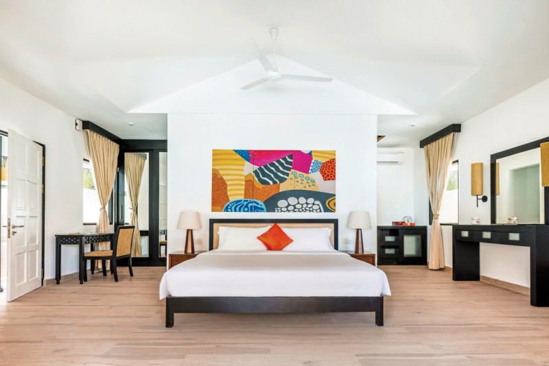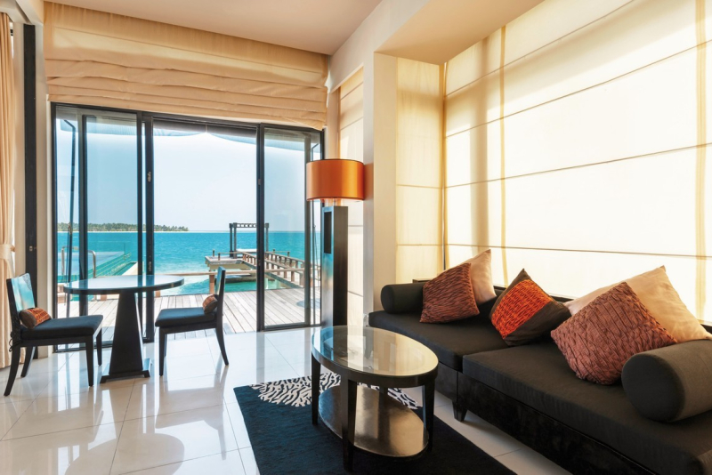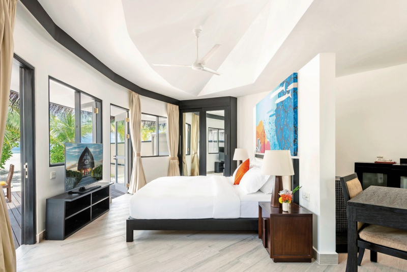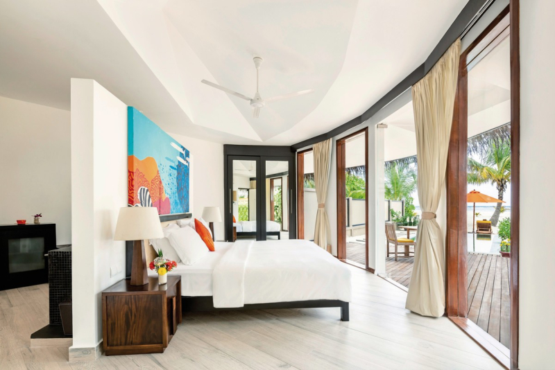 Die Villen im Angsana Velavaru sind geschmackvoll und komfortabel ausgestattet und bieten Dinge wie eine Außendusche, eine Kaffeemaschine, verschiedene Kissen, eine Terrasse mit Sonnenliegen und einen Zugang zum Strand. Die InOcean Villas befinden sich auf Stelzen über dem Wasser ca. 1 km von der Hauptinsel entfernt.