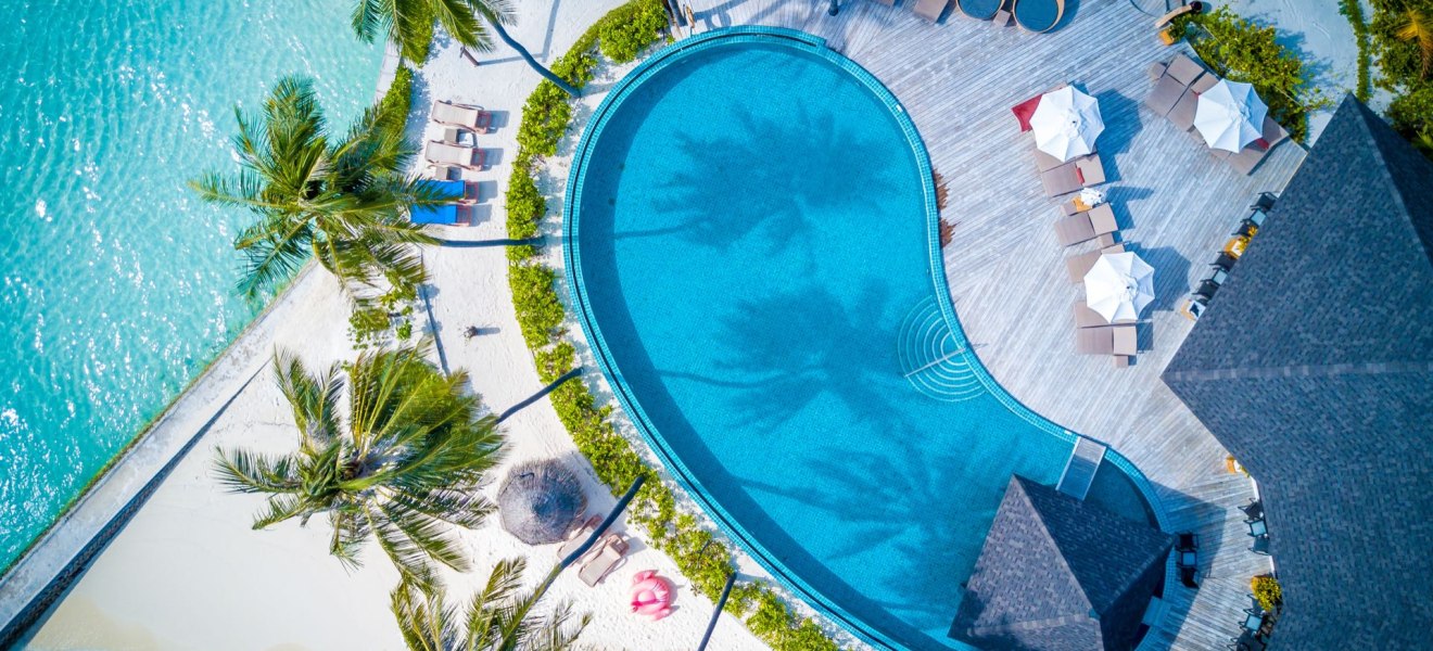 Das Resort liegt im Süd-Ari-Atoll, per Wasserflugzeug in etwa 25 Minuten von Malé erreichbar. Die Inselgröße von circa 600 mal 200 Metern schafft eine überschaubare, maritime Bühne: Wege bleiben kurz, Ausblicke weit. Der direkte Strandzugang rahmt den Tag – morgens leicht, abends mit stiller Brise.