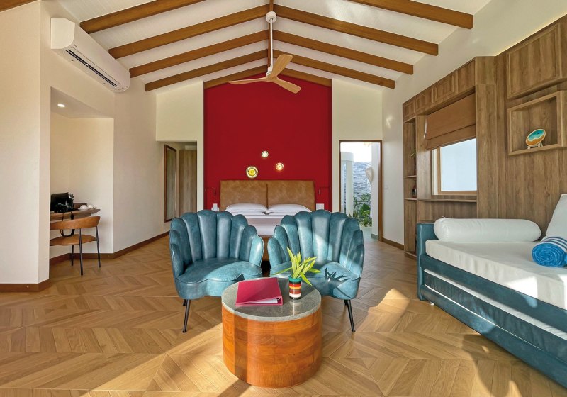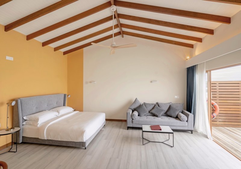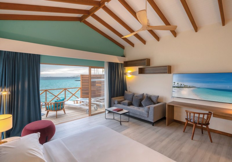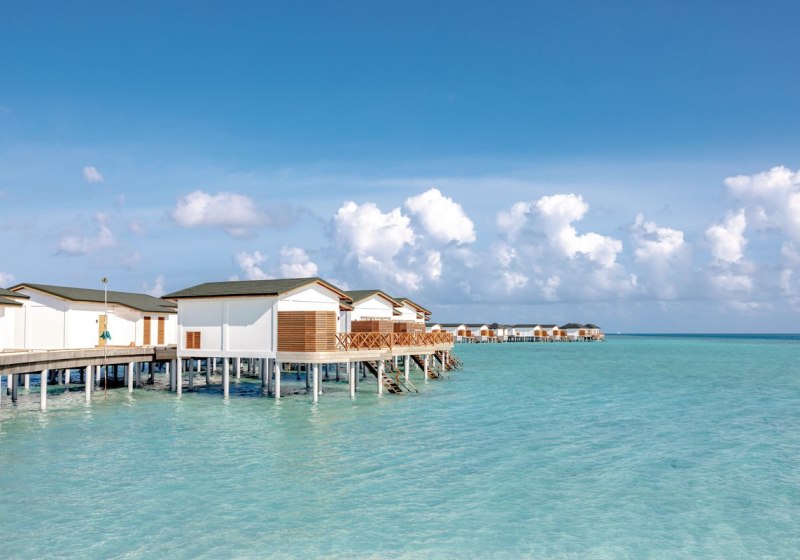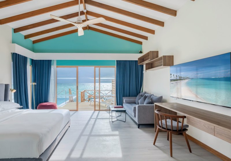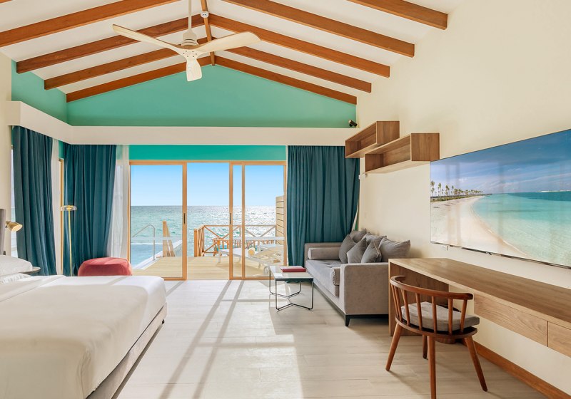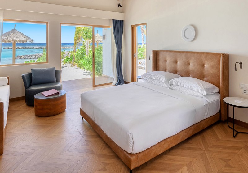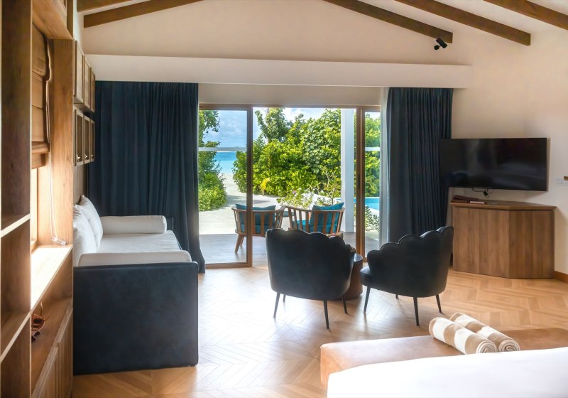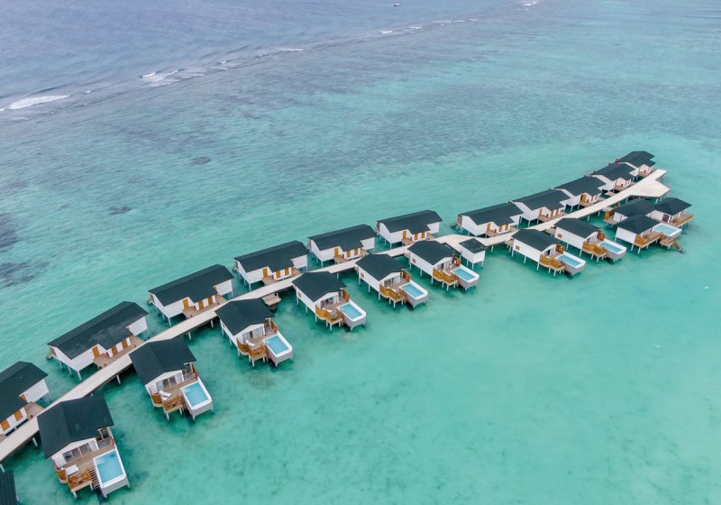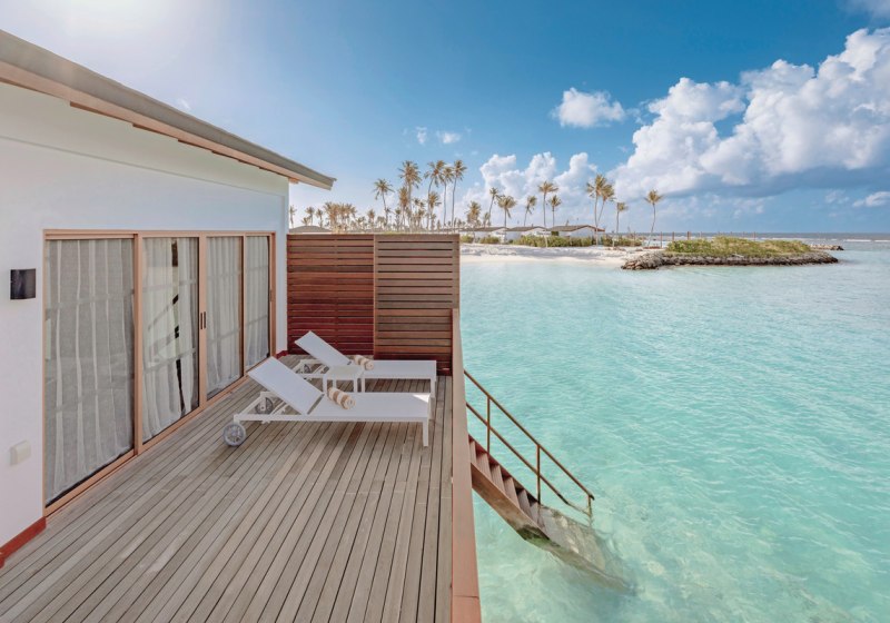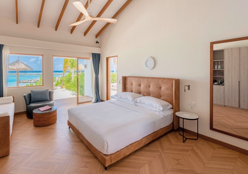 Die 151 Villen verteilen sich auf Land- und Überwasserkategorien mit klarem Mehrwert. Beach Villen (ca. 50 m²) bieten eine Terrasse und den direkten Zugang zum Strand – ideal, wenn Ihr den Tag am Wasser startet. Beach Suiten (ca. 70 m²) liefern mehr Fläche; ausgewählte Einheiten verfügen über einen privaten Pool für zusätzliche Privatsphäre und Ruhe.