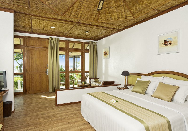 Eure Unterkunft ist klar ausgestattet: Dusche/WC, Föhn, Klimaanlage, Telefon, Safe, Sat-TV, Minibar sowie Kaffee-/Teezubereiter gehören zur Basis, ergänzt um Terrasse oder Balkon. Wer kompakt wohnen mag, wählt Beachfront Doppelzimmer mit etwa 38 Quadratmetern; mehr Raum bieten Deluxe Beachfront Zimmer mit circa 54 Quadratmetern, Badewanne und Deckenventilator.