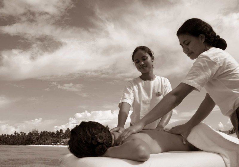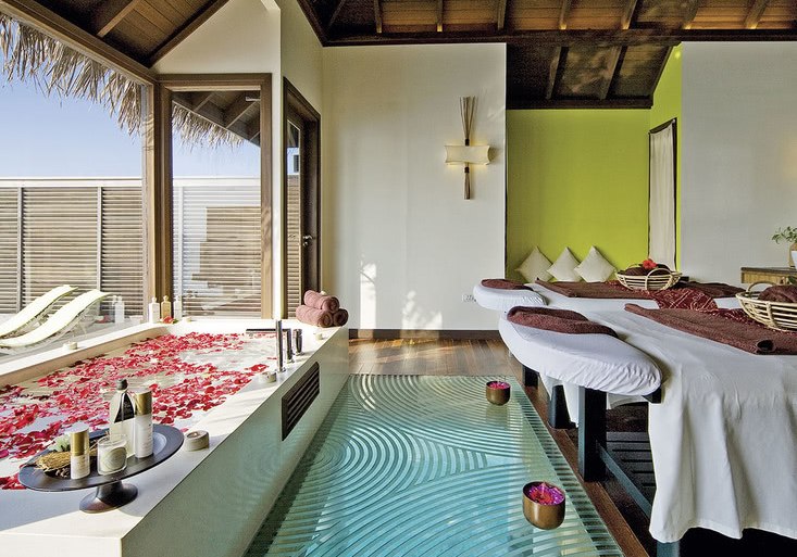 - Spa: Overwater Coco Spa mit fokussierten Anwendungen und Blickbezug.