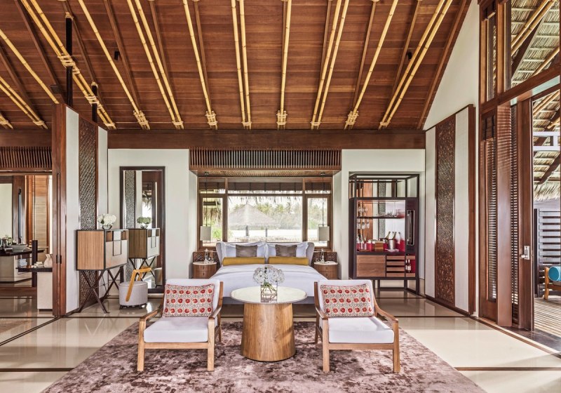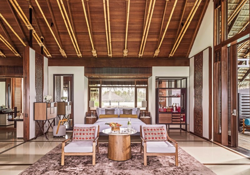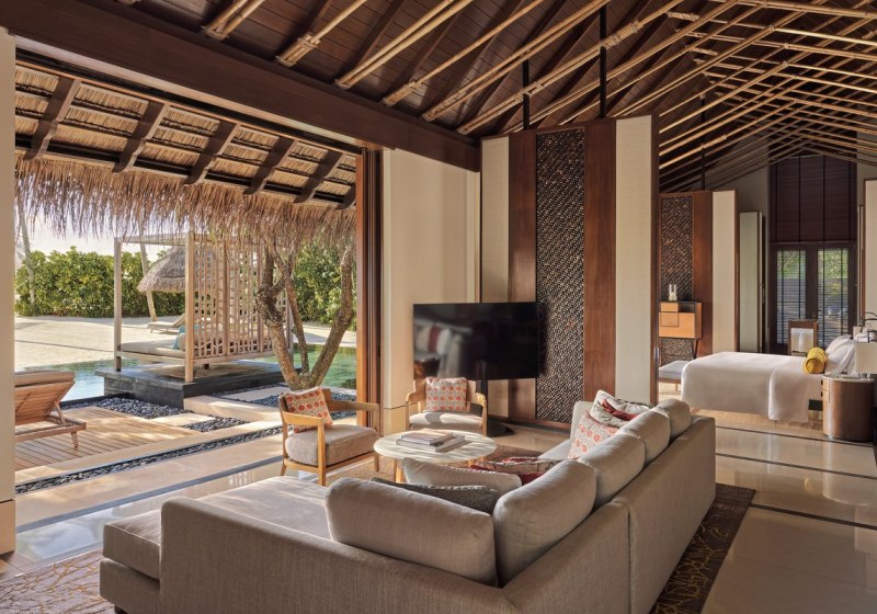 Die Beach Villas (etwa 185 m²) bieten King- oder Queen-Size-Betten, ein Bad mit großer Terrazzo-Badewanne, Regendusche und zusätzlicher Außendusche. Eine private Terrasse mit Liegestühlen verbindet Innen- und Außenbereich. Bodentiefe Fenster öffnen den Blick in die Umgebung und bringen viel Licht in den Raum. Ausstattung wie Minibar, Safe, Kaffee- und Teezubereiter sowie WiFi schafft Verlässlichkeit im Alltag.