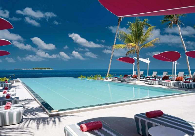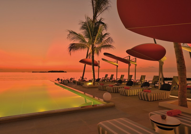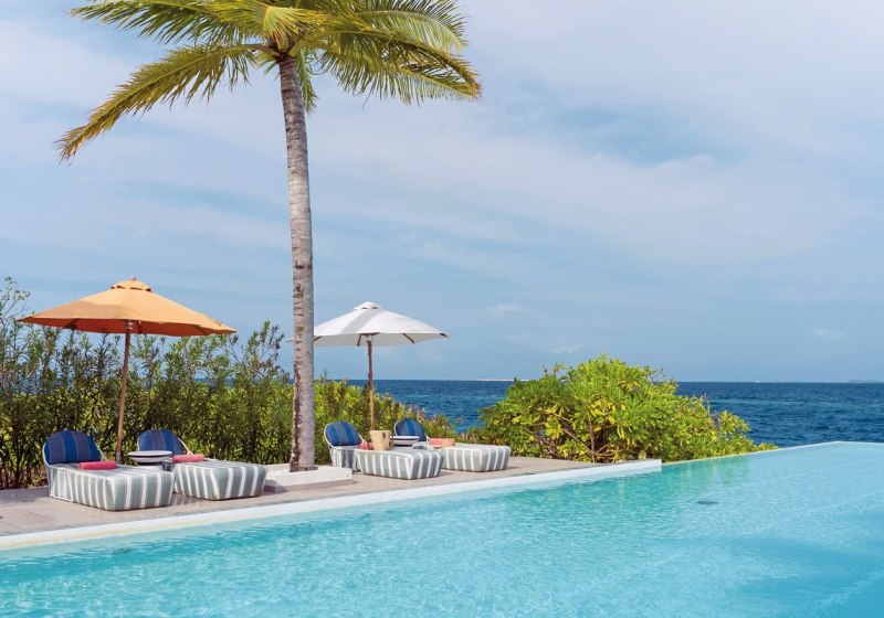• Infinity-Pool: Weitblick über die Lagune mit bequemer Liegenausstattung.