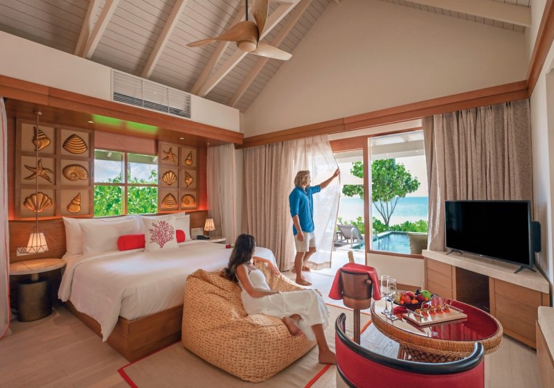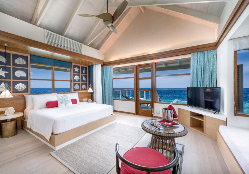 Ihr wohnt in Wasser- oder Strandvillen, teils mit Privatpool. Je nach Kategorie habt Ihr direkten Zugang zum Meer oder zum Strand. Die Ausstattung ist umfassend: Klimaanlage, Minibar, Safe, TV, WLAN, Badewanne, Regendusche, Bademantel, Haartrockner sowie Bügeleisen und Bügelbrett.