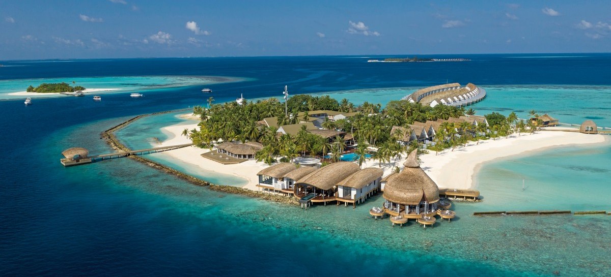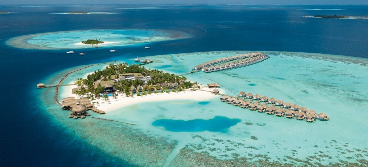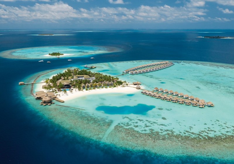 Das Resort liegt auf den Malediven auf einer überschaubaren Insel von etwa 500 mal 350 Metern. Rundum zieht sich ein Sandstrand, direkt davor beginnt das Hausriff nur wenige Schritte vom Ufer entfernt. Der Transfer per Wasserflugzeug dauert ungefähr 25 Minuten, sodass Ihr schnell auf der Insel ankommt.