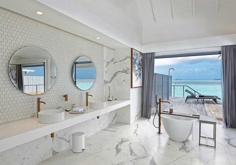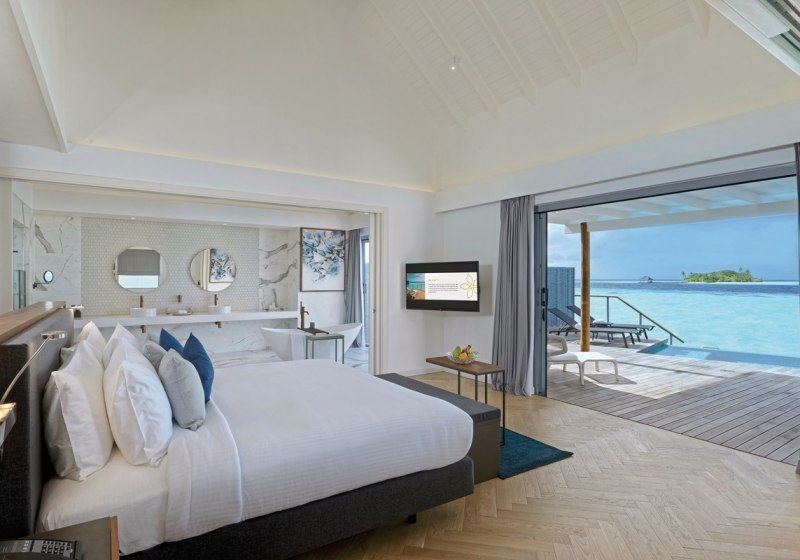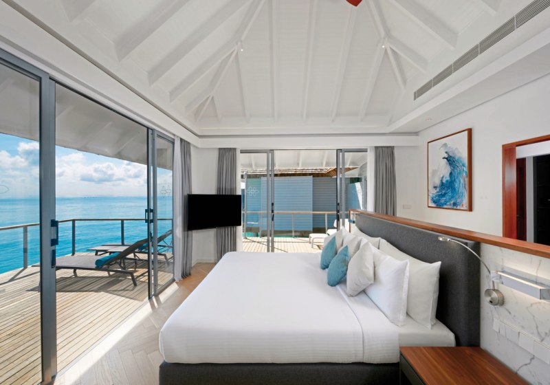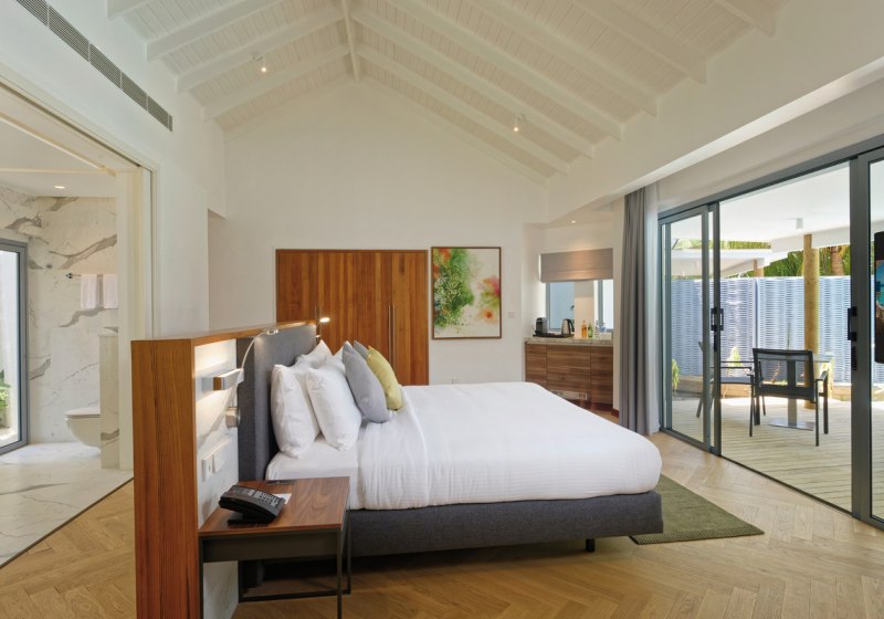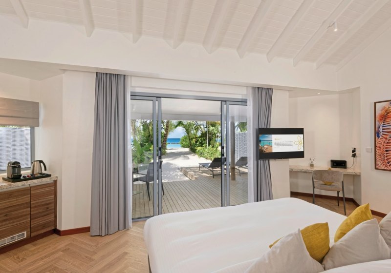 Ihr wohnt in Strand- oder Überwasservillen als Einzelhäuser – mit viel Privatsphäre und unmittelbarem Zugang zu Strand oder Meer. Jede Villa bietet eine möblierte Terrasse, teils zusätzlich einen Balkon. Das Design bleibt reduziert und funktional, der Blick führt nach draußen, wo Wasser und Licht den Ton angeben.