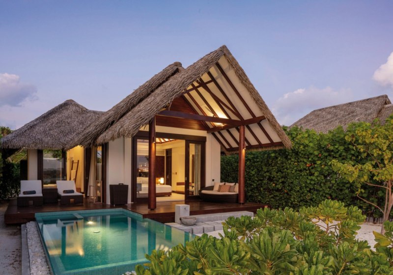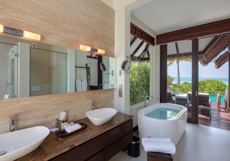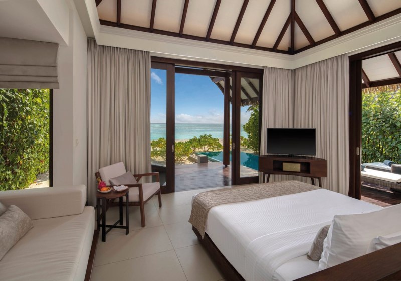 Mehr Privatsphäre liefert die Pool Beach Villa (ca. 93 m² inkl. Außenbereich) mit eigenem Pool und Sonnenliegen. Familien breiten sich in der Family Pool Beach Villa (ca. 186 m²) mit zweitem Schlafzimmer aus. Über dem Meer wohnt Ihr in der Ocean Villa mit direktem Meerzugang; die Ocean Suite (ca. 180 m²) ergänzt dies um privaten Pool. Overwater-Einheiten verfügen über keine Außendusche.