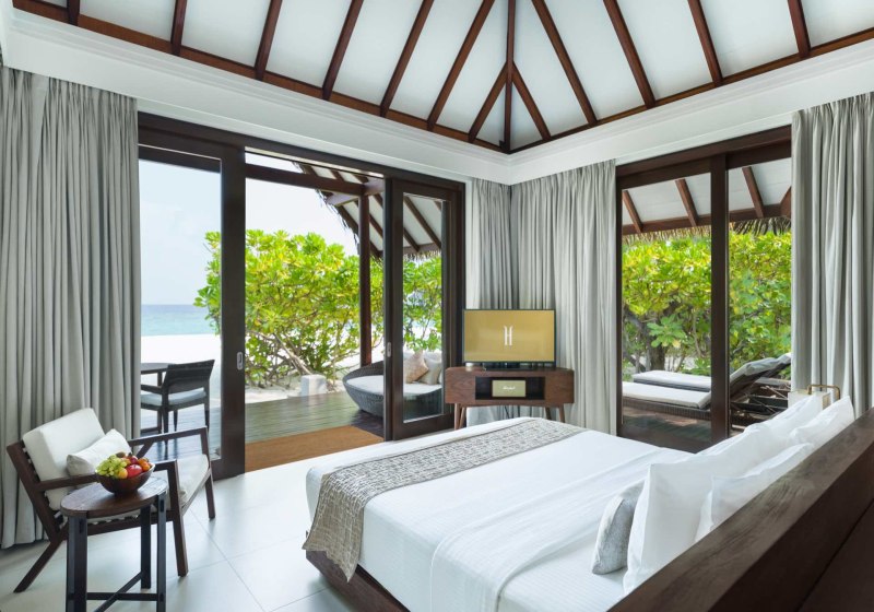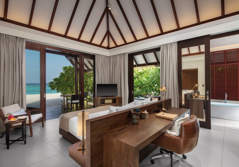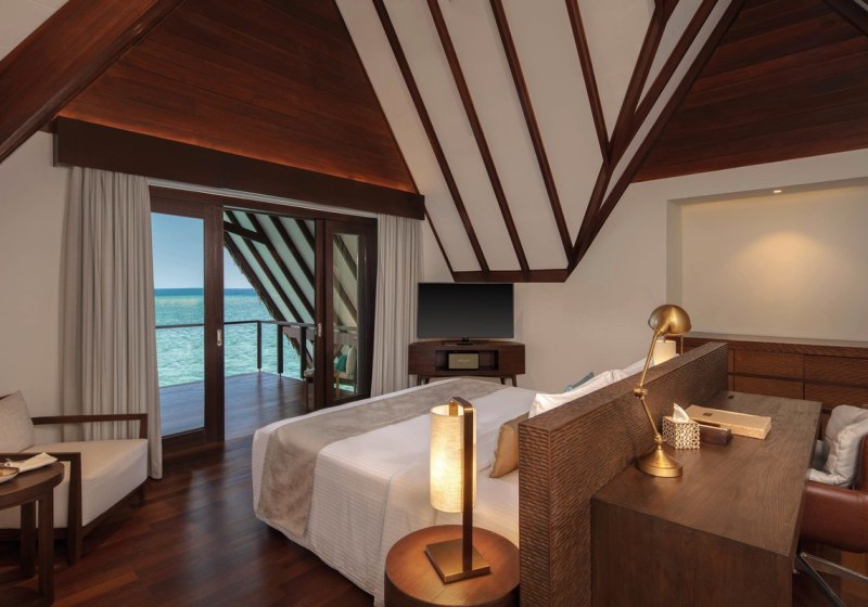 Ihr wählt zwischen Strandnähe und Stelzenidylle über dem Wasser. Die Beach Villa (ca. 88 m² inkl. Außenbereich) bietet Badewanne/WC, Außendusche, Bademantel/Slipper, Föhn, Klimaanlage, Minibar, Flatscreen-TV, Safe sowie Kaffee-/Teezubereiter. Tagesbett und Sonnendeck führen direkt an den Strand – ideal für frühe Schwimmeinheiten.