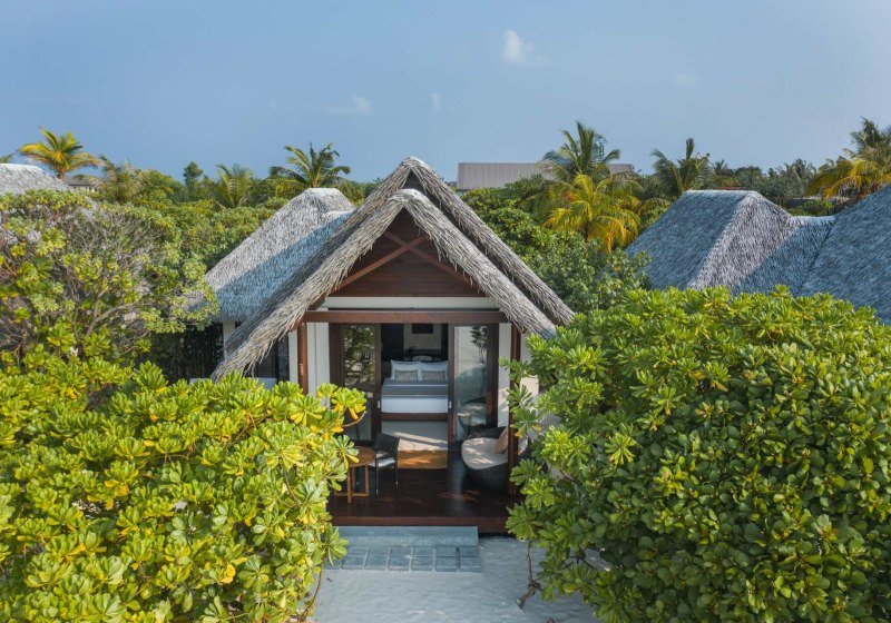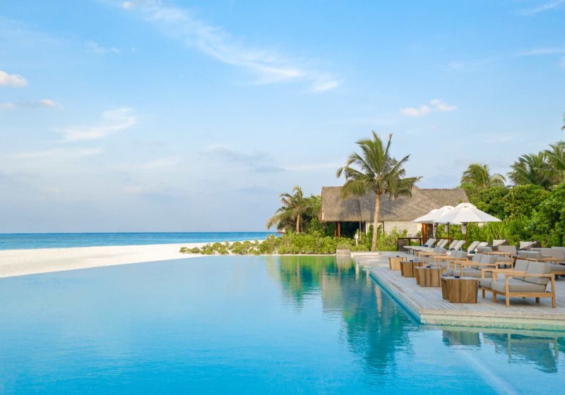 Ein besonderer Akzent ist der Overwater Infinitypool, der exklusiv den Ocean Suiten vorbehalten ist. So genießt Ihr dort Ruhe und Meerblick ohne Publikumsverkehr. Insgesamt sorgen 150 Villen und Suiten für angenehme Verteilung über die Insel. Handtücher, Sonnenplätze und schmale Pfade zwischen Strand und Vegetation vervollständigen das Bild.