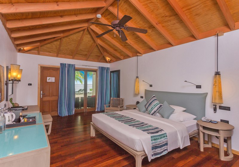 Die 184 Villen verteilen sich auf Garten, Strand und Wasser – jede Kategorie mit einem prägnanten Charakter. Garden Bungalows bieten etwa 55 Quadratmeter mit halboffenem Bad, Dusche, WC, Föhn, Klimaanlage, Deckenventilator, Minibar, Kaffee- und Teezubereiter, Telefon, Safe und möblierter Terrasse. Adjoining Beach Villas öffnen die Terrasse zum Strand mit Meerblick. Highlight: Klare Wahl zwischen Gartenruhe und direkter Strandlinie.