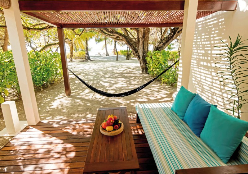 Alle Villen verfügen über ein halboffenes Bad mit Dusche/WC, Föhn, Klimaanlage, Bademantel/Slipper, Bügelbrett, Safe, Sat-TV, Radio, Telefon, Minibar, Badetücher sowie Kaffee-/Teezubereiter. Ein privater Garten mit Veranda und Hängematte ergänzt den Rückzugsraum um eine stille Draußen-Komponente. So entsteht eine Mischung aus Privatsphäre und Strandnähe, die Euren Tagesablauf angenehm gliedert. Highlight: Veranda mit Hängematte als ruhiger Außenbereich.