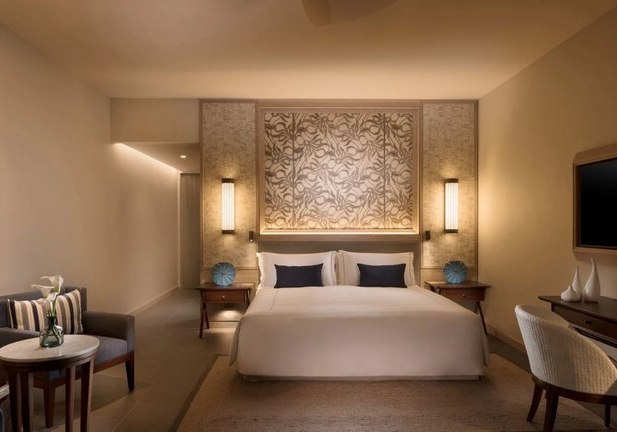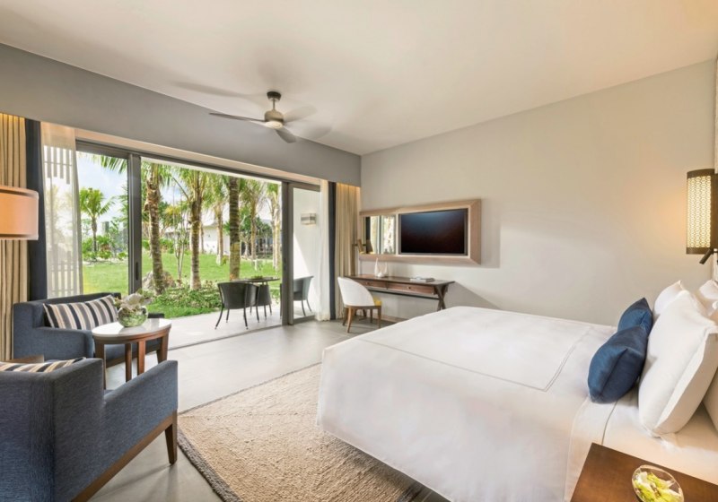 Die Zimmer starten bei etwa 55 Quadratmetern und bieten King-Size-Bett oder zwei Einzelbetten, Bad mit Regendusche und Badewanne sowie Balkon oder Terrasse mit Garten- oder Meerblick. Eine Nespresso-Maschine gehört ebenso zur Ausstattung wie Klimaanlage, Safe und Sitzbereich für entspannte Stunden.