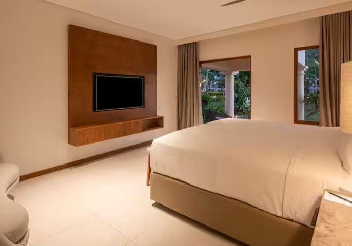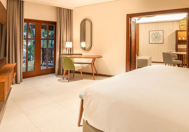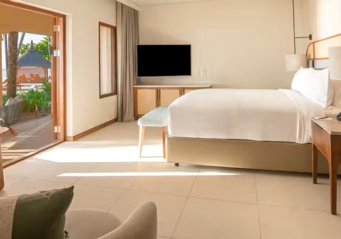 Im Hilton Mauritius Resort & Spa wohnt Ihr direkt an der Westküste von Mauritius, geschützt von einer Lagune und mit flach abfallendem Sandstrand vor der Tür. Die Anlage wirkt weitläufig, mit Wasserläufen, kleinen Wasserfällen und einer Poollandschaft, die sich harmonisch zwischen Gärten und Terrassen einbettet. Highlight: Direkte Strandlage mit Lagune – ruhig, sicher und klar strukturiert.