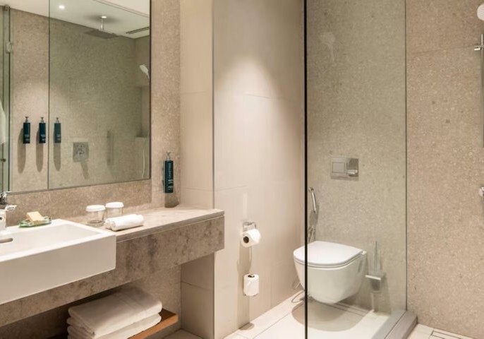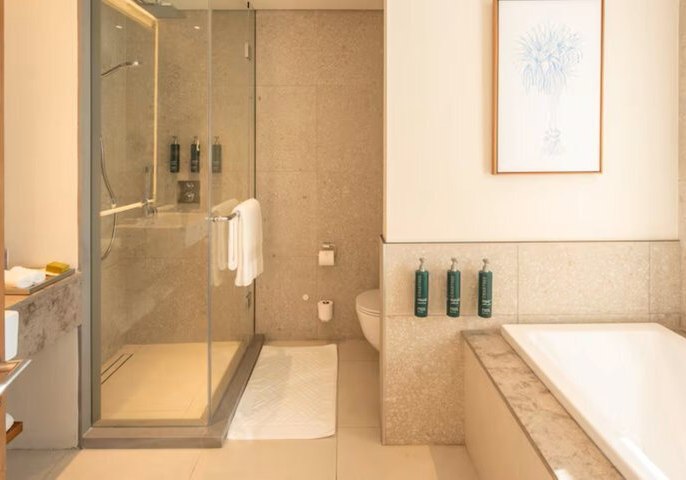 Für den kleinen Start in den Tag steht der Kaffee-/Teezubereiter bereit, der Kühlschrankbereich wird durch die Minibar ergänzt. Textilien wie Bademäntel und Föhn sind gesetzt, sodass Ihr nach Strand und Spa unkompliziert die Übergänge gestaltet – vom Wasser zum Dinner.