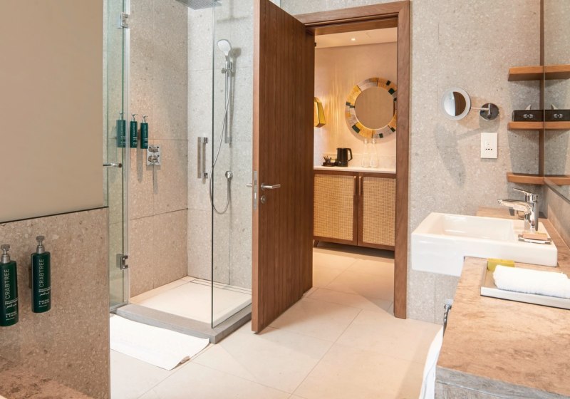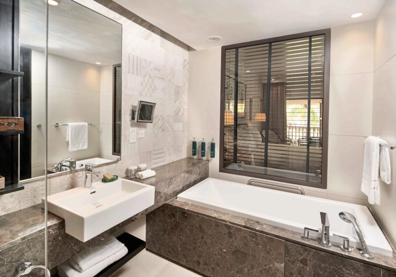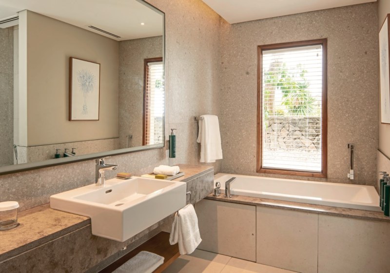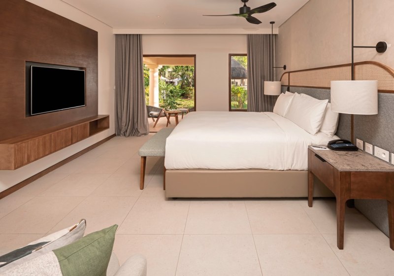 Die Außenflächen der Zimmer greifen das Lagunen-Thema auf: kurze Wege zum Garten, zu den Wegen und zum Strand. Das Tageslicht fällt großzügig ein, am Abend schafft die Beleuchtung ruhige Zonen für den Rückzug nach Dinner oder Livemusik.