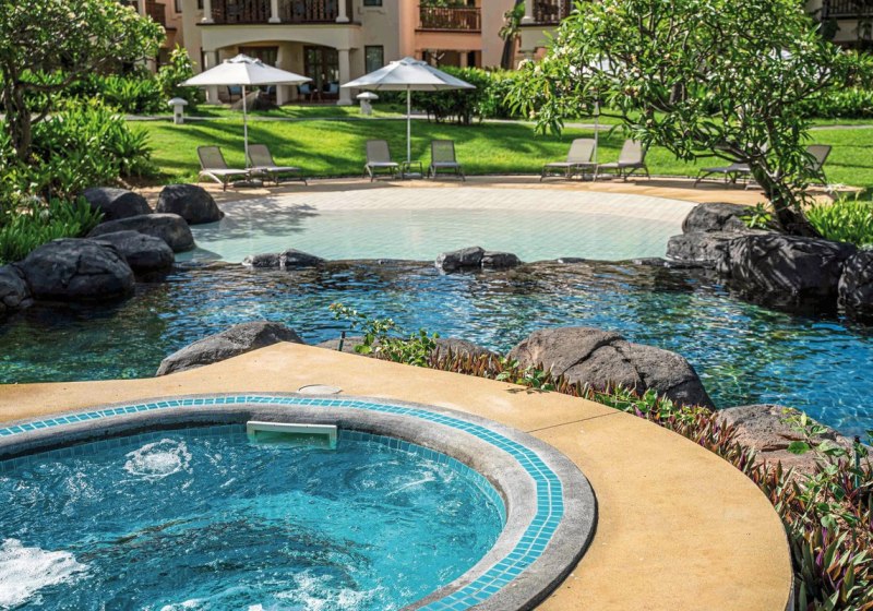 - Wasserlandschaft: Pools mit Lagunencharakter, Wasserfällen und Unterwassermusik.
